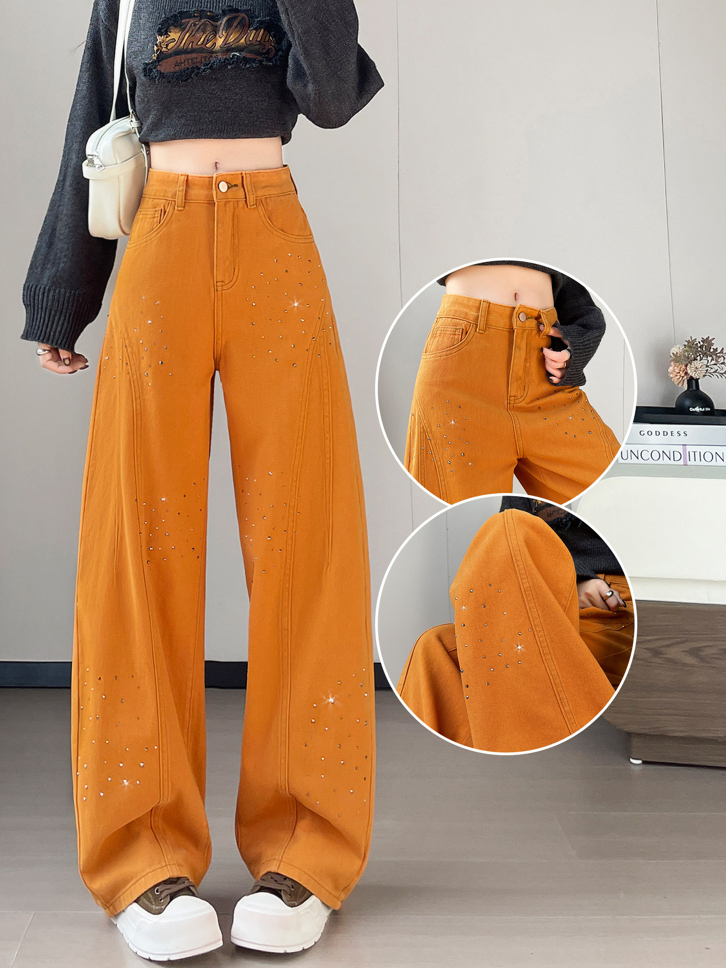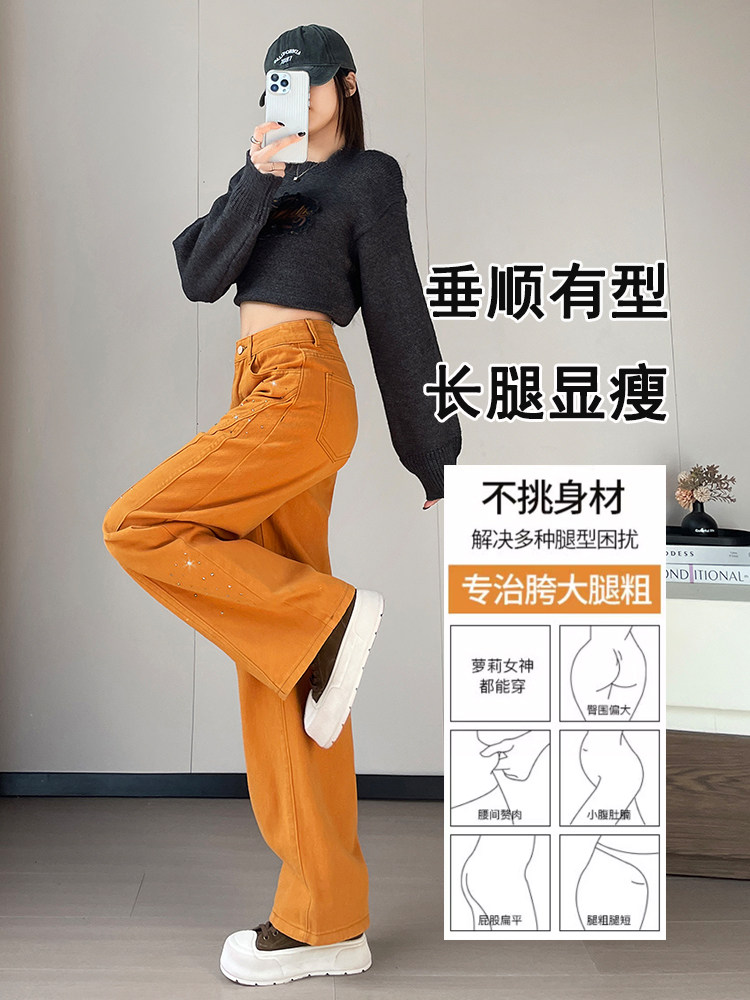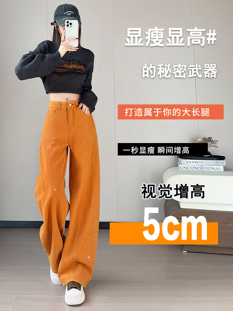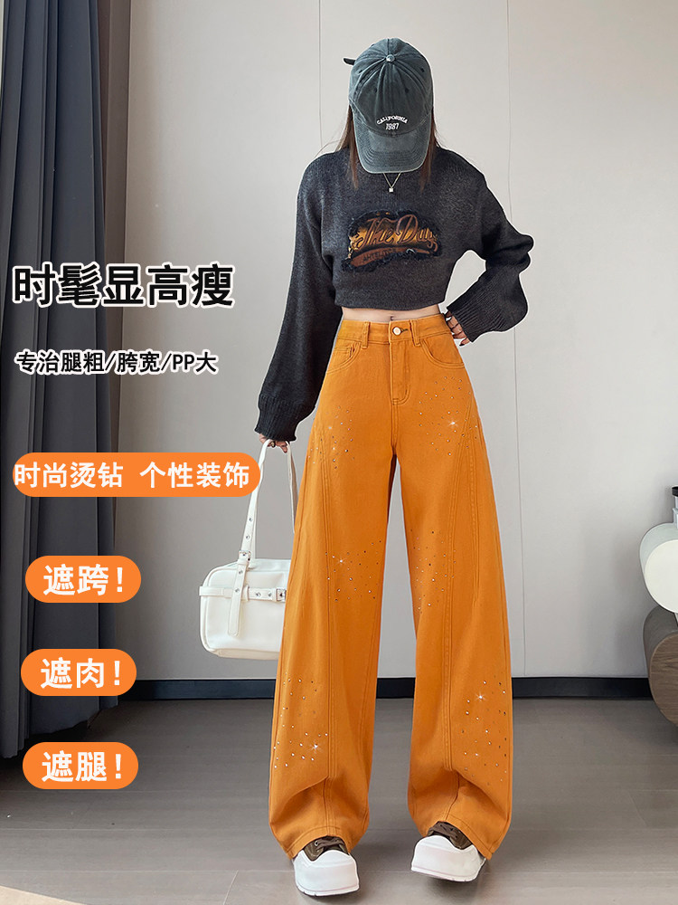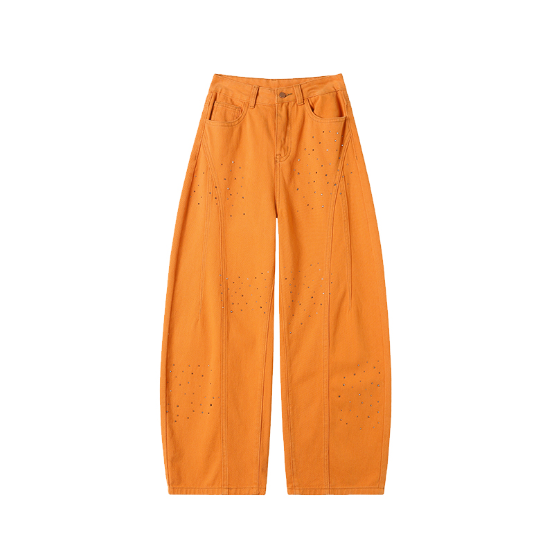 FA53614# 南瓜橙烫钻弯刀牛仔裤女春季新款辣妹高腰宽松阔腿裤子