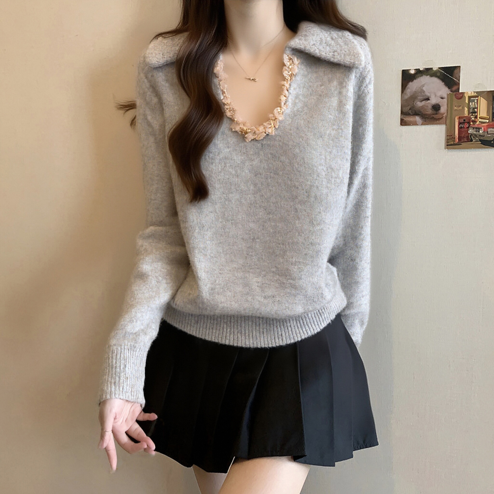 FA53687# 法式复古高级感翻领亮片毛衣女秋冬大码胖MM慵懒外穿宽松针织上衣