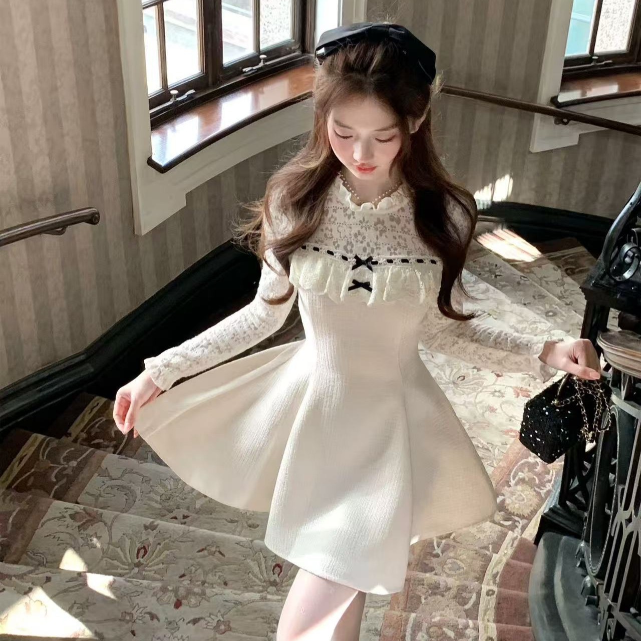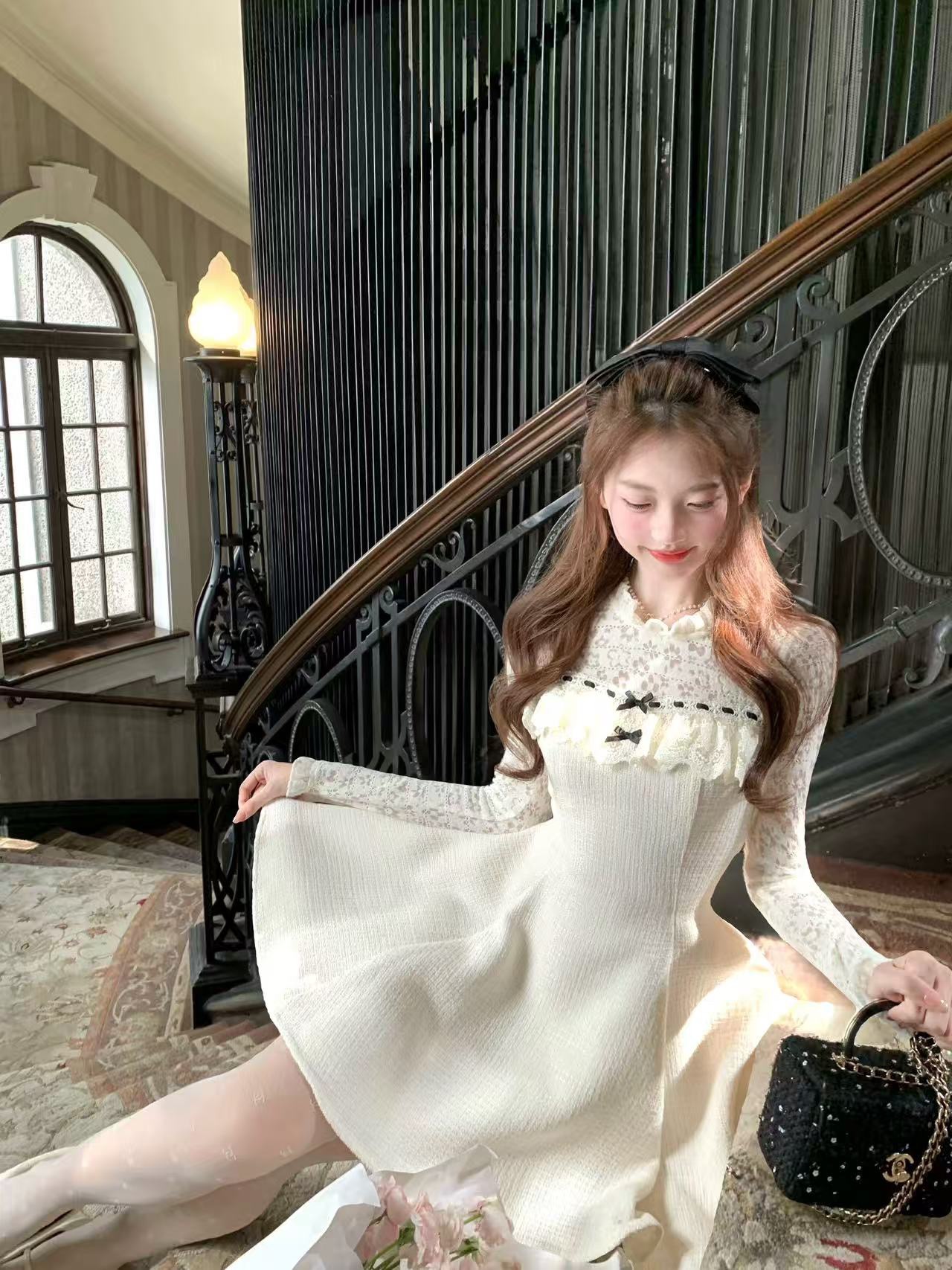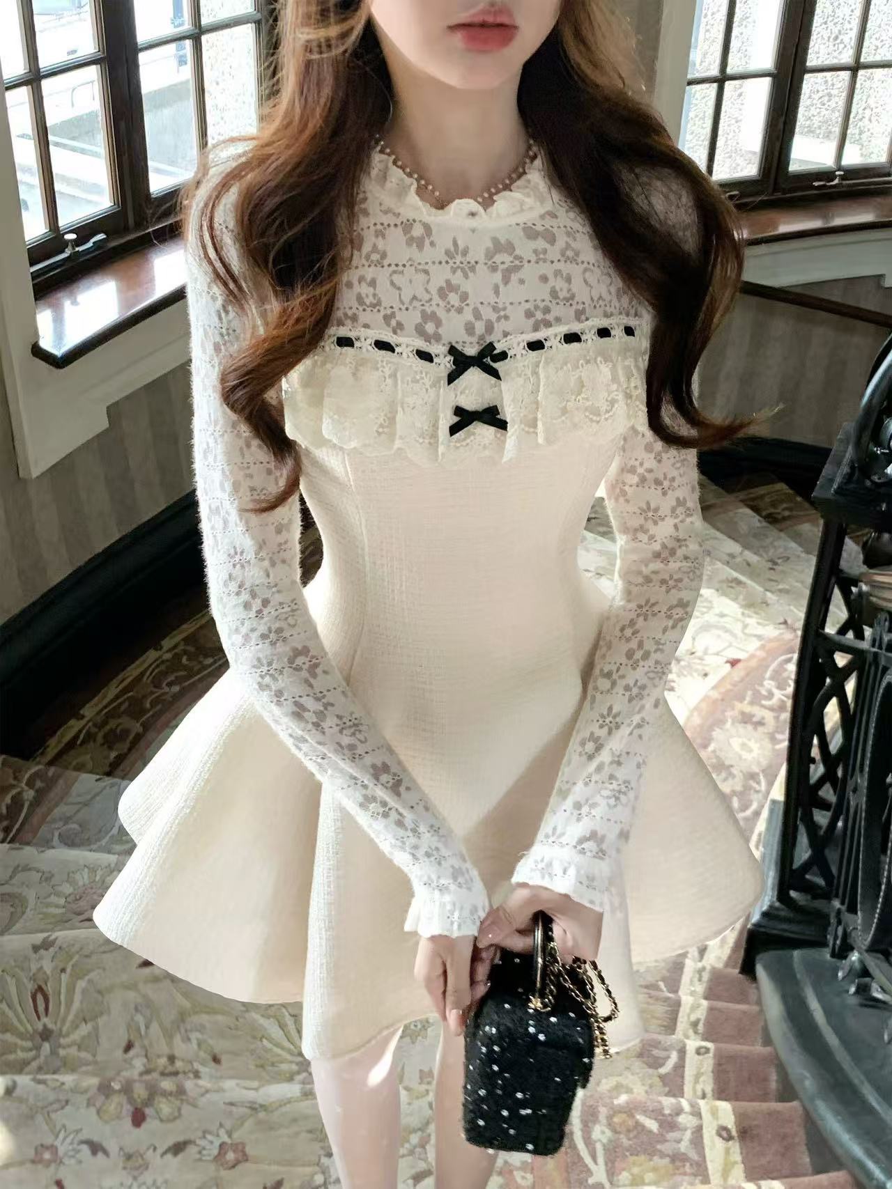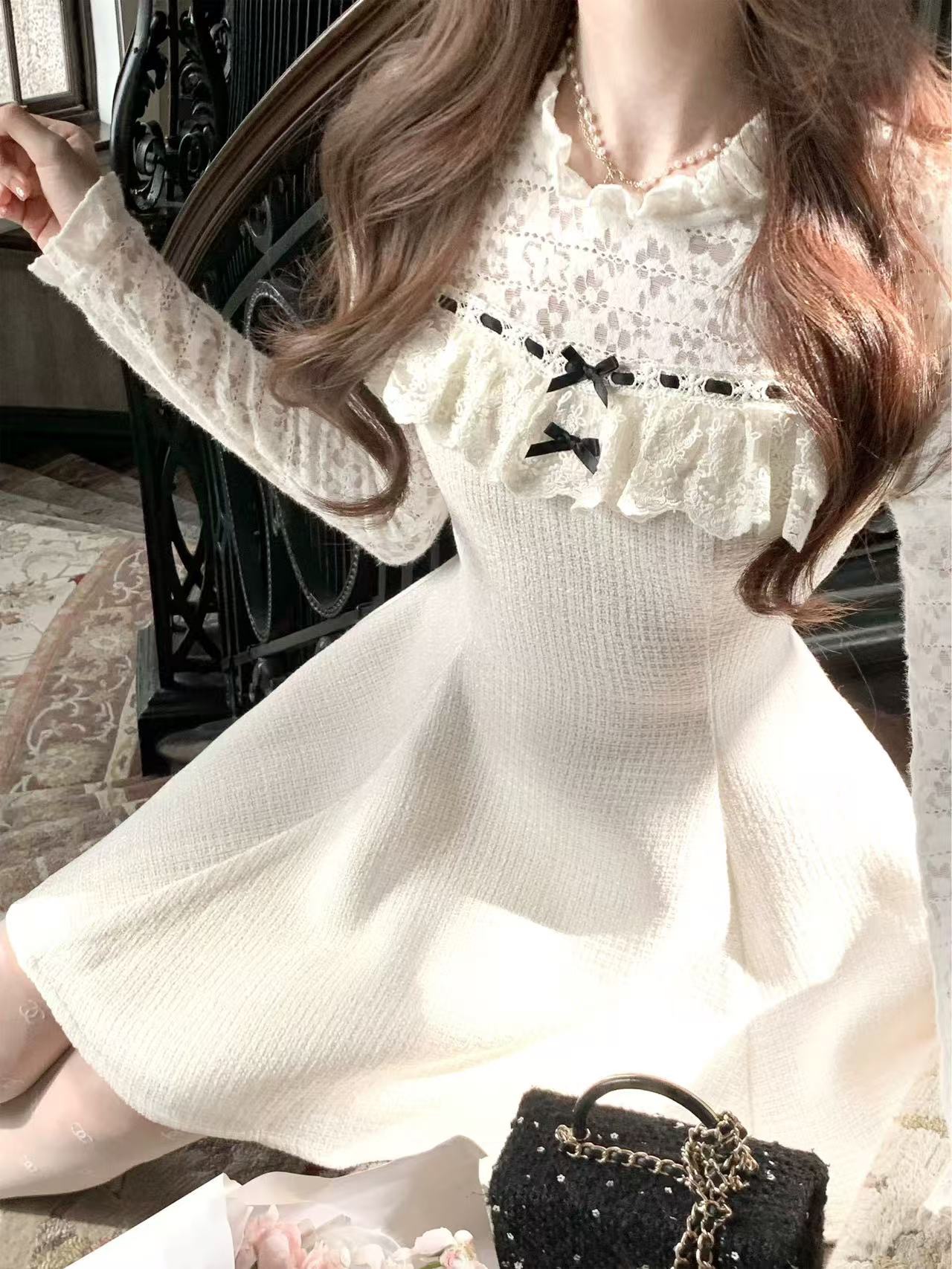 FA53708# 雪绒香榭千金感小香风拼接蕾丝花边精致年会连衣裙