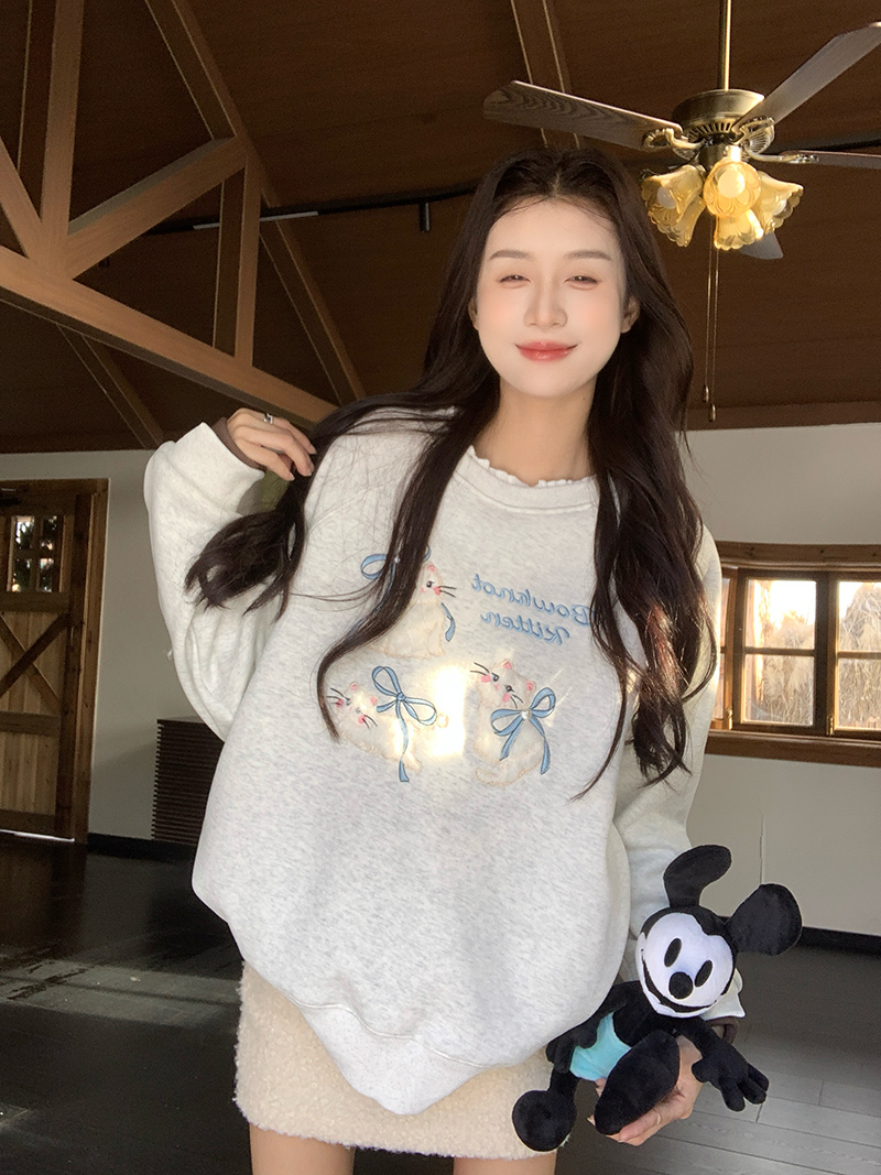 FA54068# 加绒卫衣秋冬潮新款宽松假两件刺绣花蝴蝶结圆领保暖上衣 服裝批發女裝批發服飾貨源