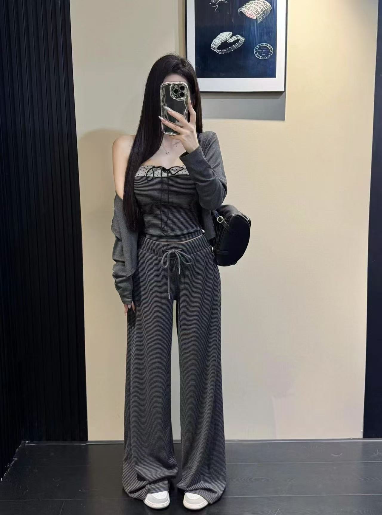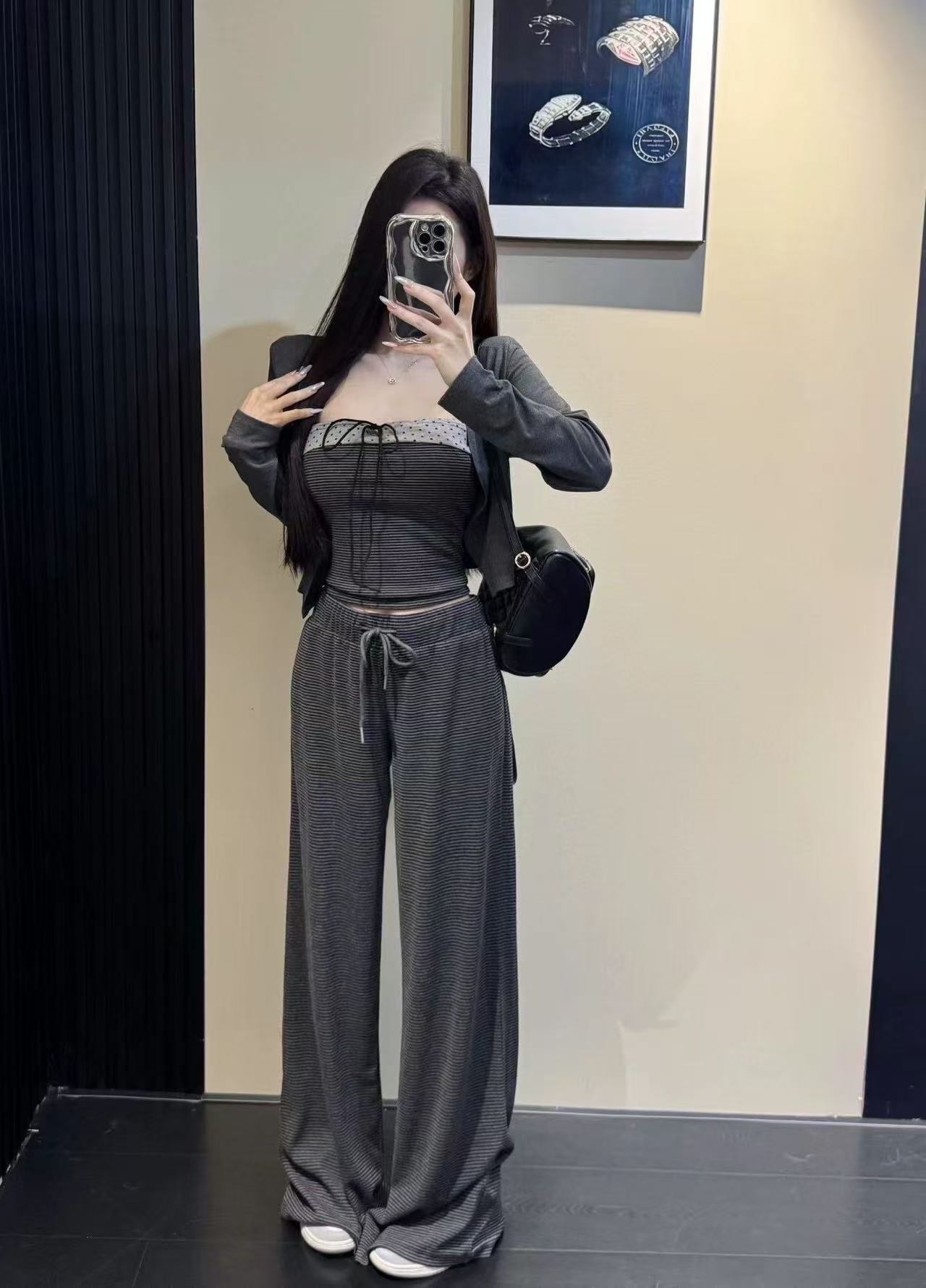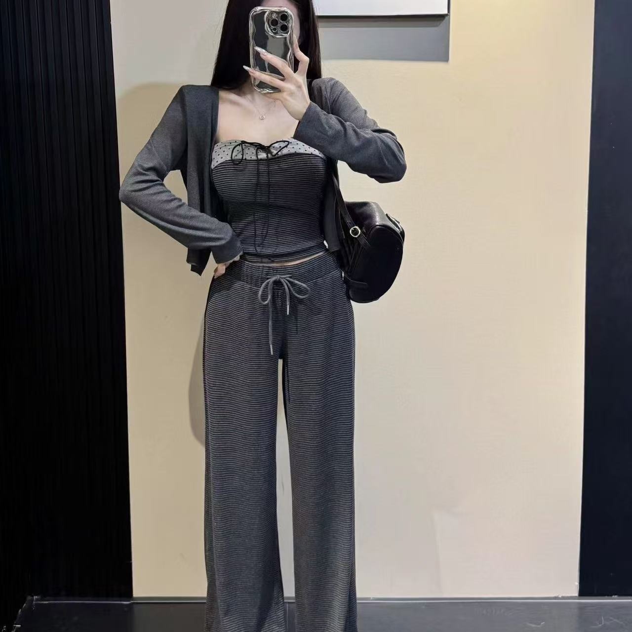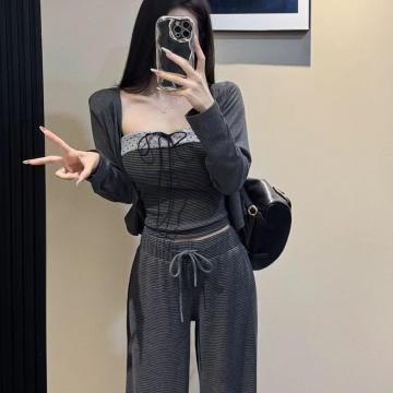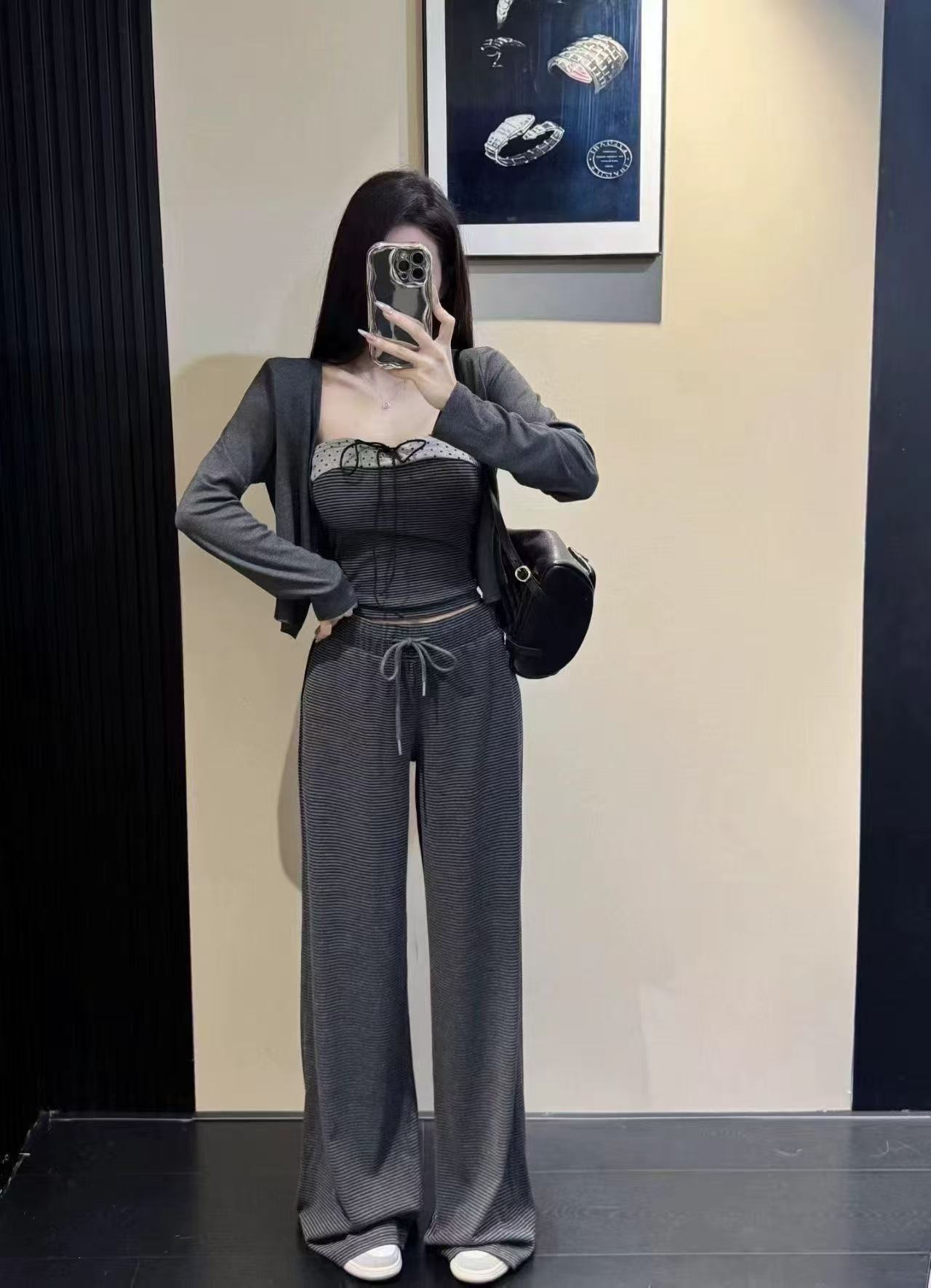 FA54081# 新款韩版时尚短款小开衫+吊带背心+松紧腰条纹阔腿裤三件套 服裝批發女裝批發服飾貨源