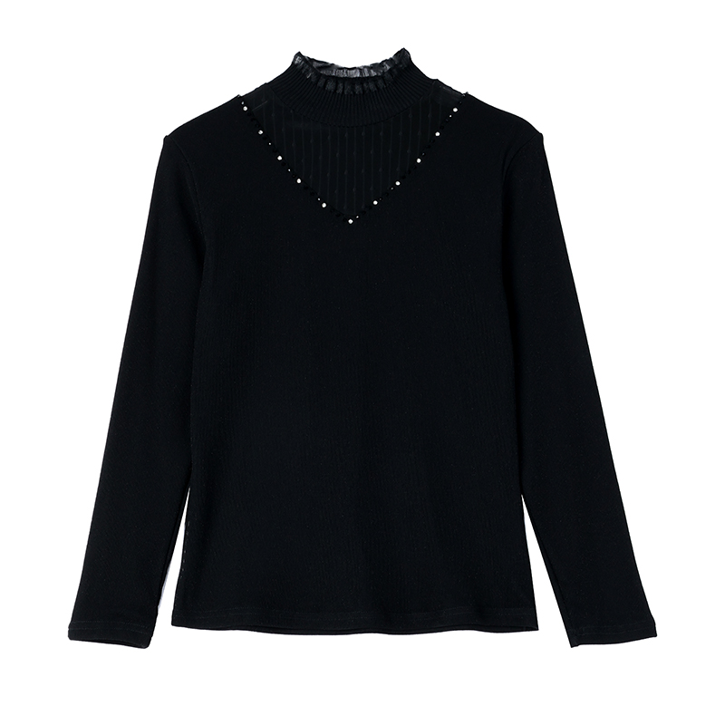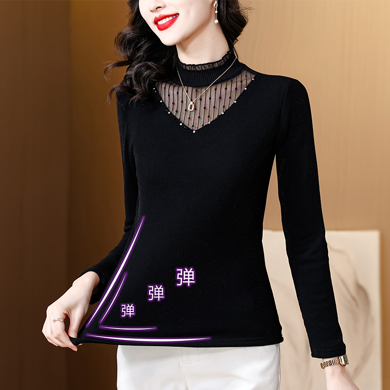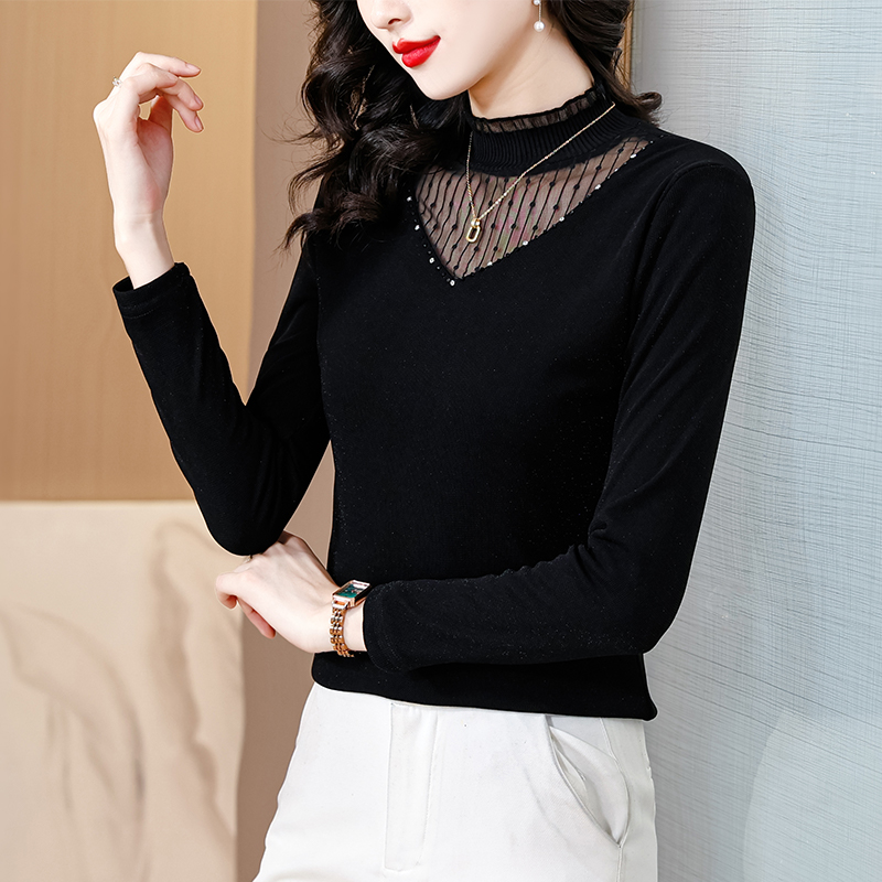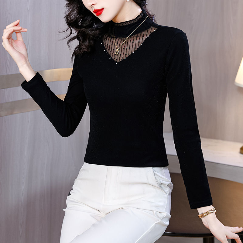 FA54293# 春季装网纱蕾丝打底衫手工钉珠女时尚洋气加绒内搭上衣 服裝批發女裝批發服飾貨源