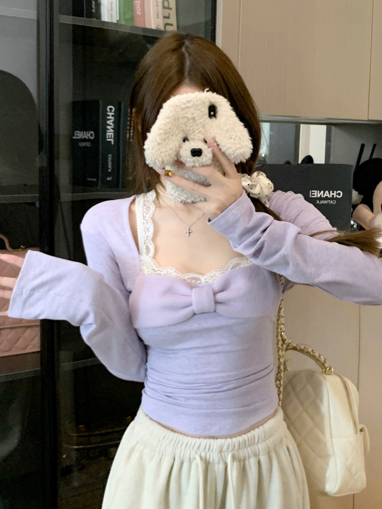 FA54320# 纯欲性感方领蕾丝边长袖T恤女辣妹修身内搭蝴蝶结打底衫 服裝批發女裝批發服飾貨源
