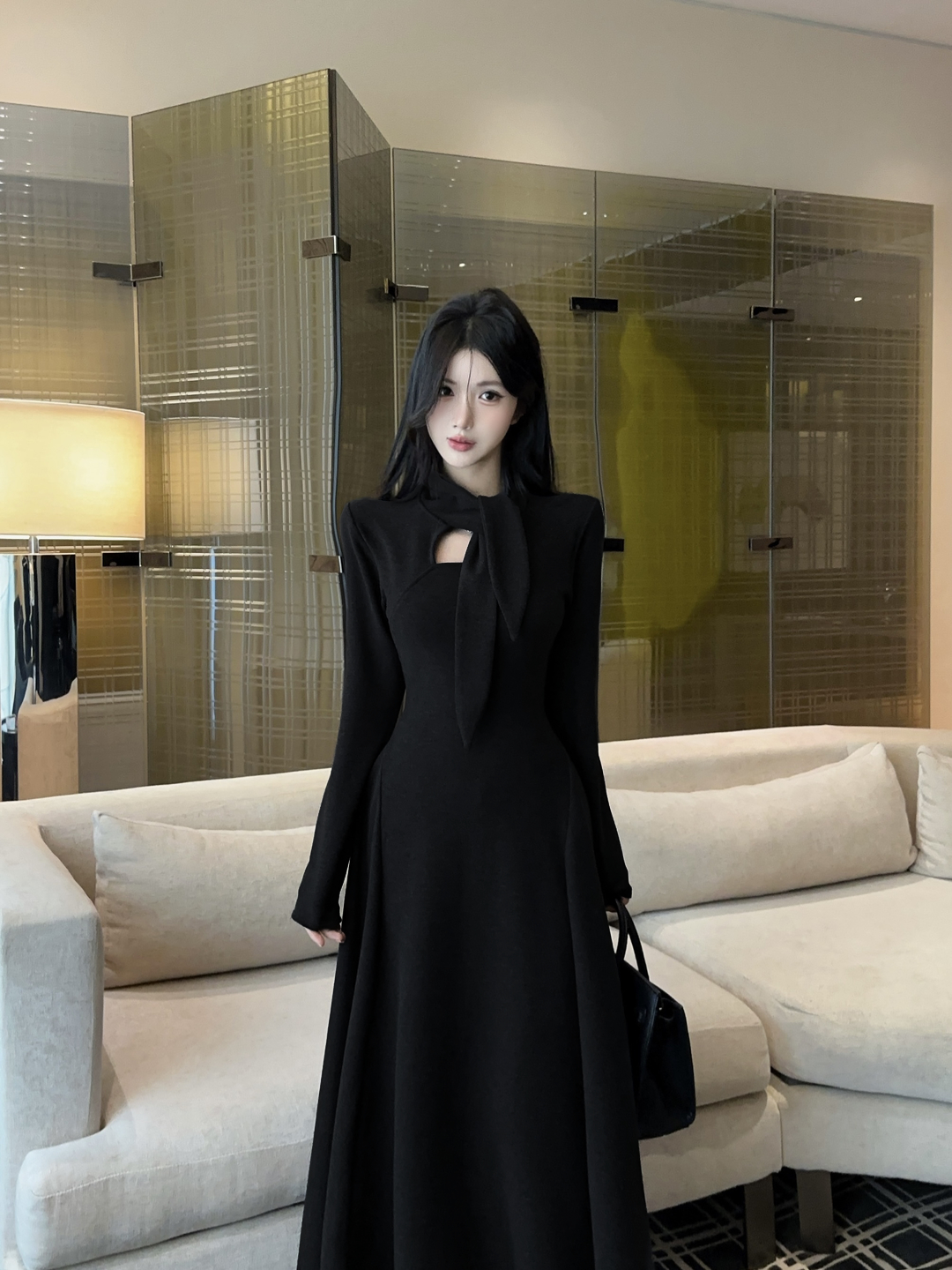 FA54324# 纯欲挂脖飘带长袖连衣裙女性感修身显瘦气质百搭高级长裙 服裝批發女裝批發服飾貨源