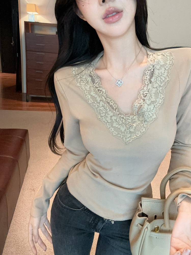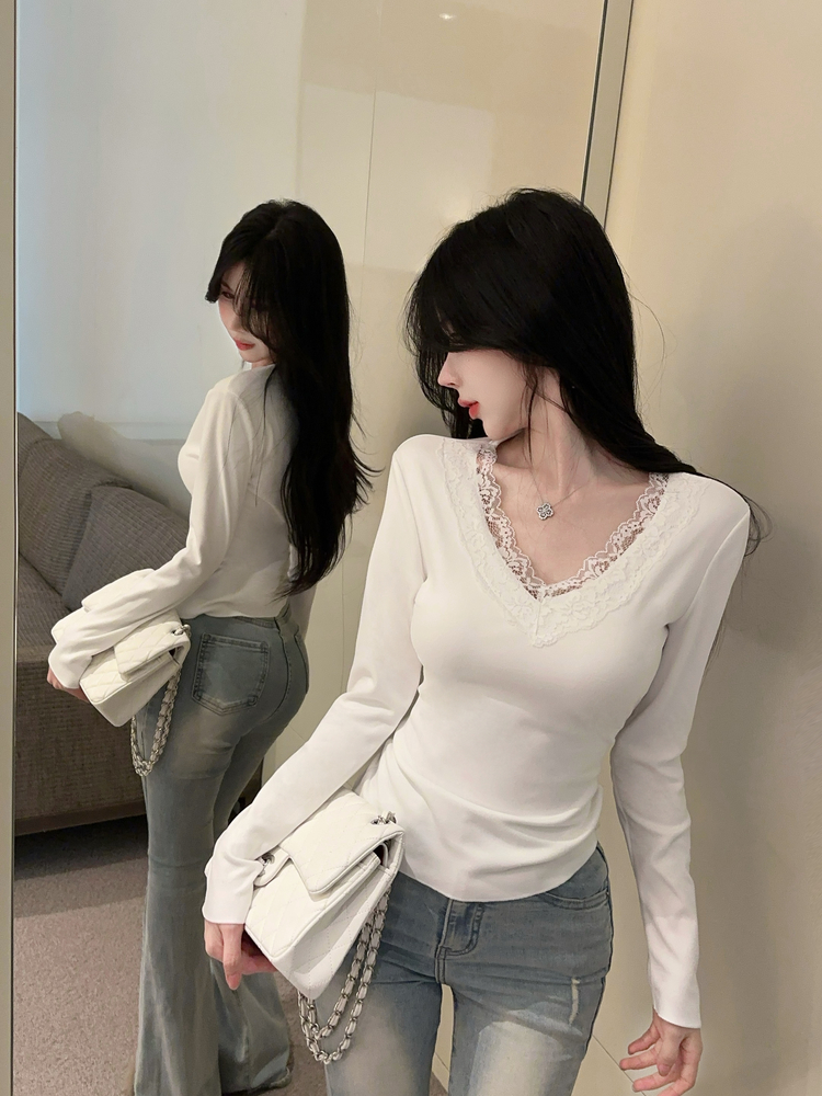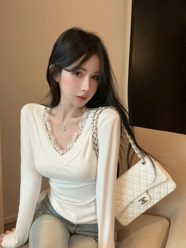 FA54328# 纯欲蕾丝内搭打底衫女秋冬季小香上衣白色V领茶艺长袖T恤 服裝批發女裝批發服飾貨源