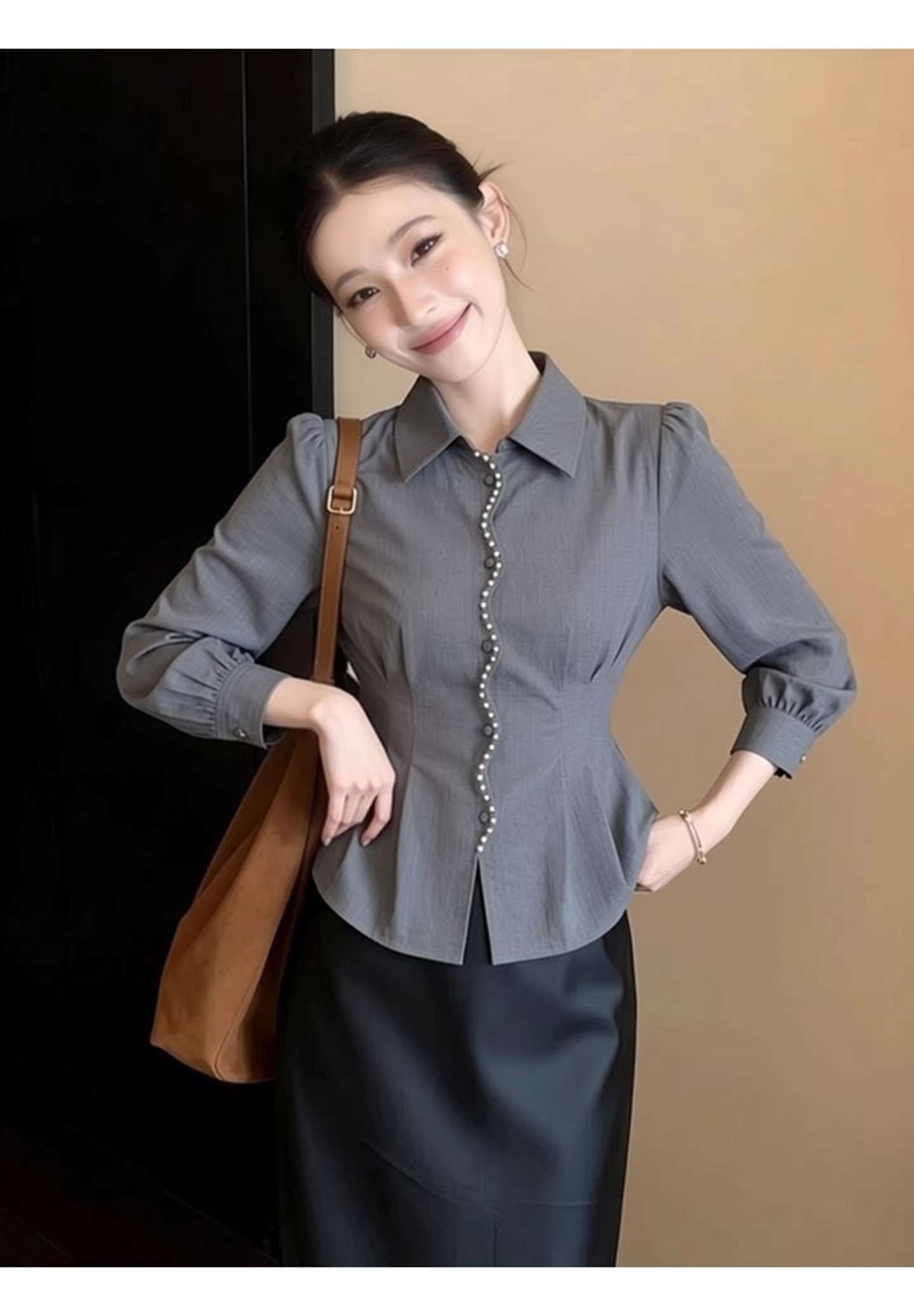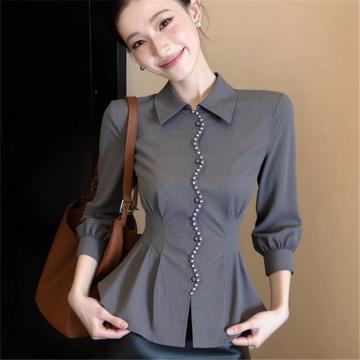 FA54332# 春季收腰设计感气质显瘦上衣巨好看轻熟独特别致绝美灰色长袖衬衫 服裝批發女裝批發服飾貨源