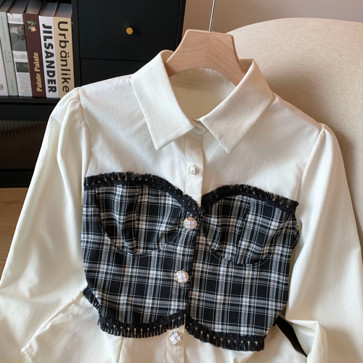 FA54401# 设计感撞色格子拼接假两件翻领长袖衬衫女秋收腰上衣 服裝批發女裝批發服飾貨源