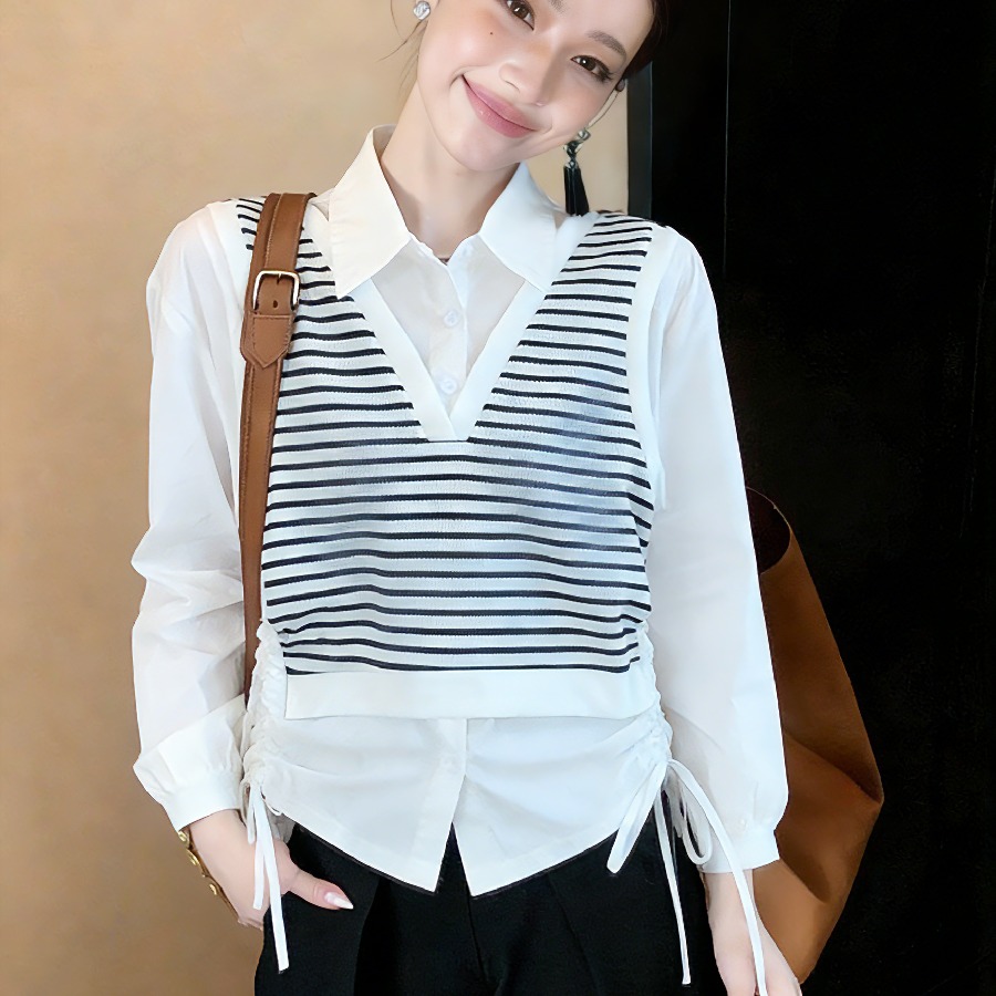 FA54508# 假两件条纹拼接衬衫女新款韩版春季气质POLO领抽绳上衣小衫 服裝批發女裝批發服飾貨源