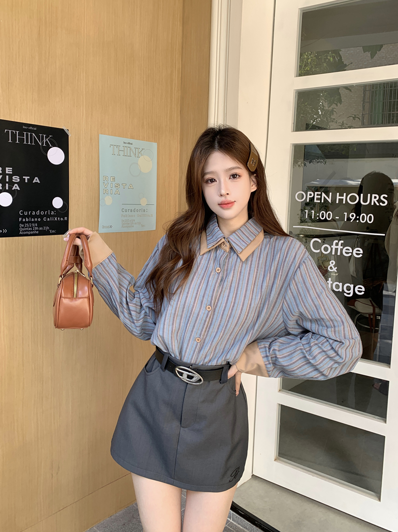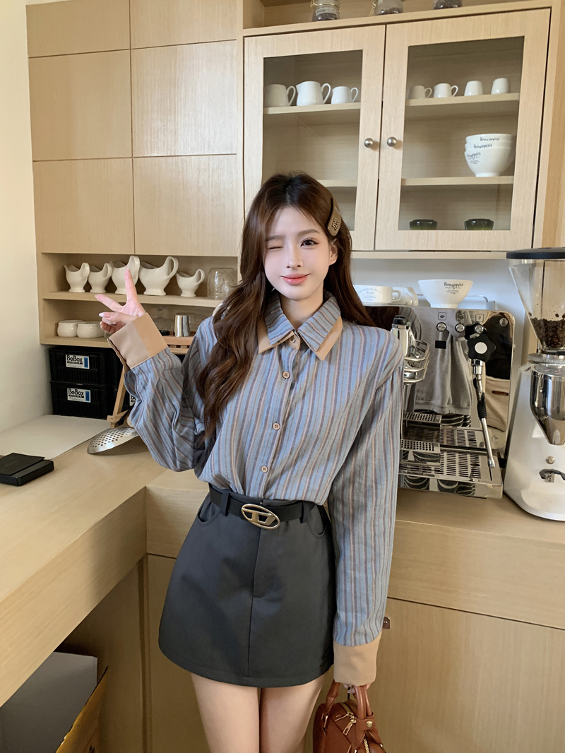FA54642# 复古设计感条纹长袖衬衫女小众新款别致高级感Polo领上衣 服裝批發女裝批發服飾貨源