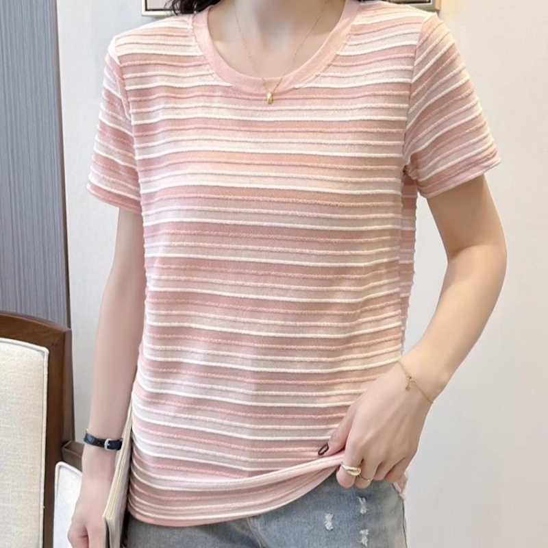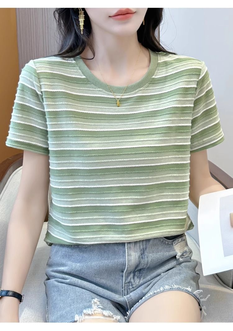 FA55093# 女士新款休闲减龄穿搭显瘦短袖夏季简约时尚慵懒条纹圆领T恤 服裝批發女裝批發服飾貨源