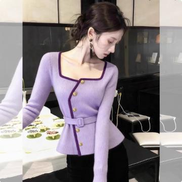 FA55115# 小香风紫色方领不规则针织衫长袖女款秋季新款绑带收腰毛衣上衣潮 服裝批發女裝批發服飾貨源