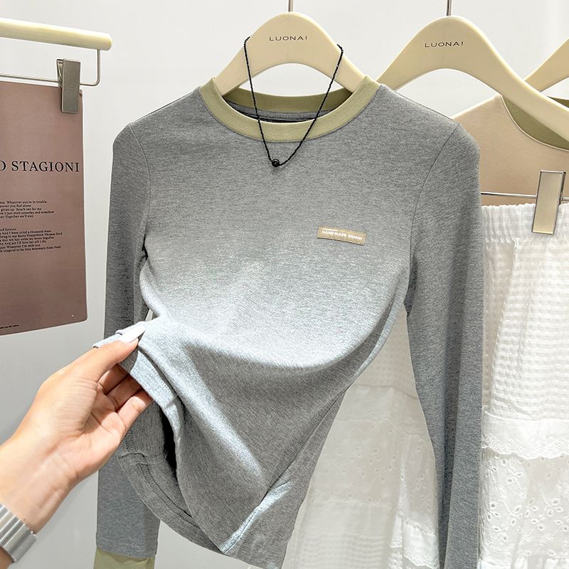FA55119# 拼色假两件内搭长袖t恤女春装新款圆领修身德绒打底衫上衣女 服裝批發女裝批發服飾貨源