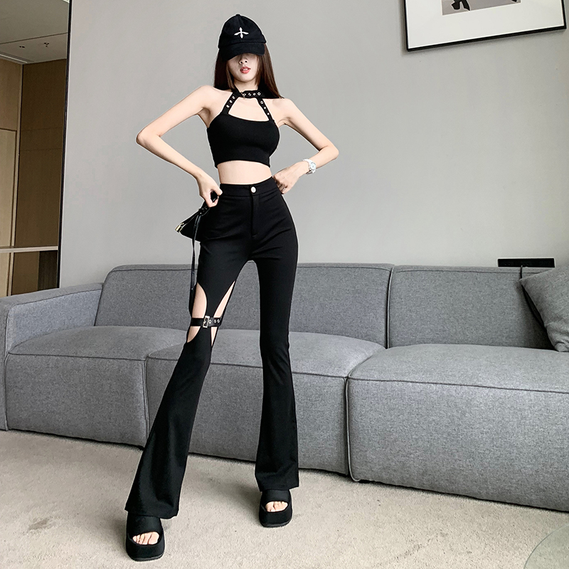 FA55126# 黑色微喇西装裤子春夏季薄款性感镂空高腰设计感破洞休闲拖地长裤 服裝批發女裝批發服飾貨源