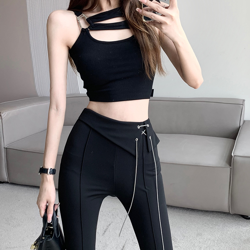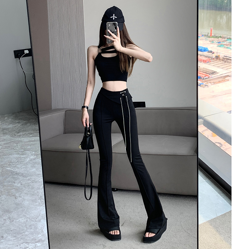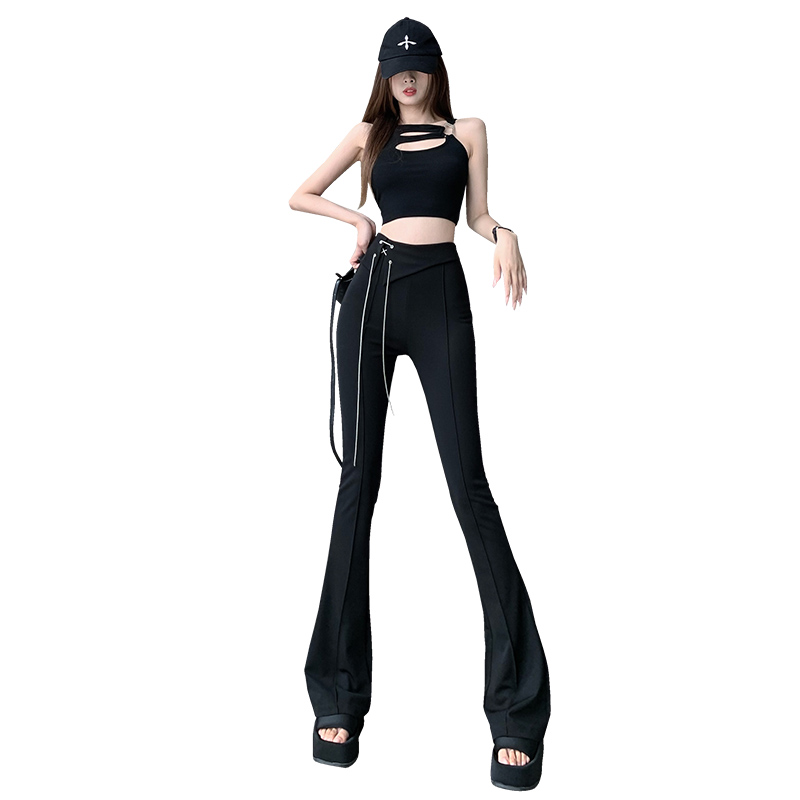 FA55127# 黑色微喇西装裤女夏款修身显瘦设计感链条翻边高腰休闲拖地马蹄裤 服裝批發女裝批發服飾貨源