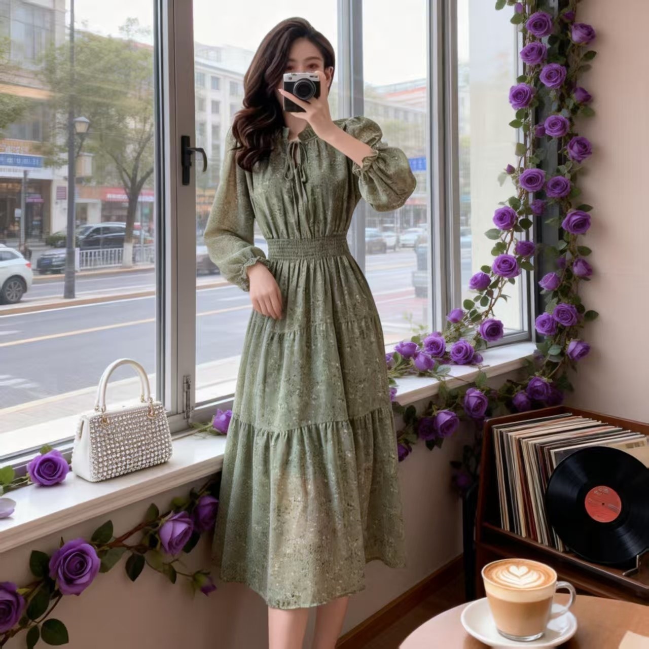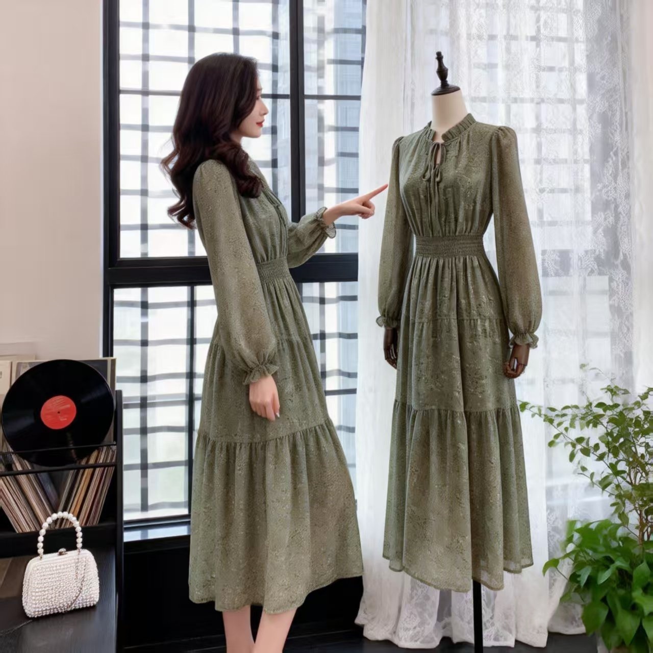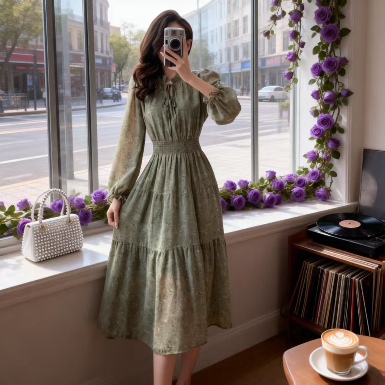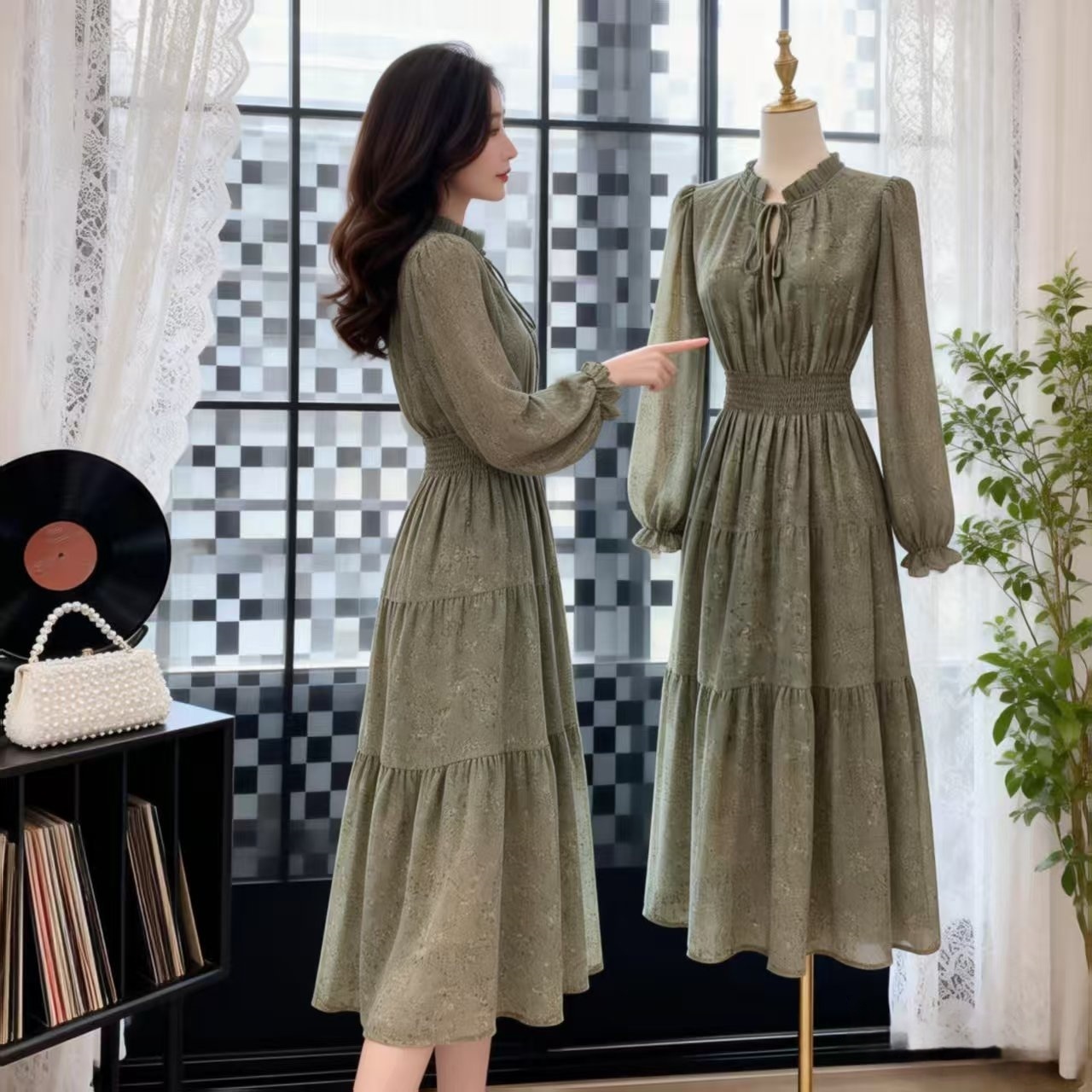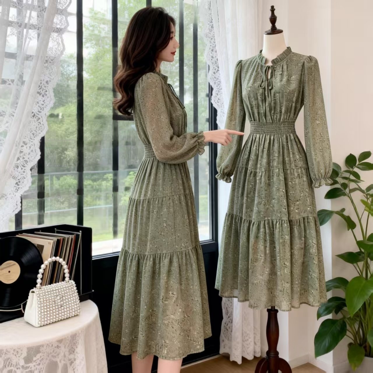 FA55130# 秋法式复古甜美荷叶领连衣裙灯笼袖松紧腰显瘦印花裙雪纺裙 服裝批發女裝批發服飾貨源