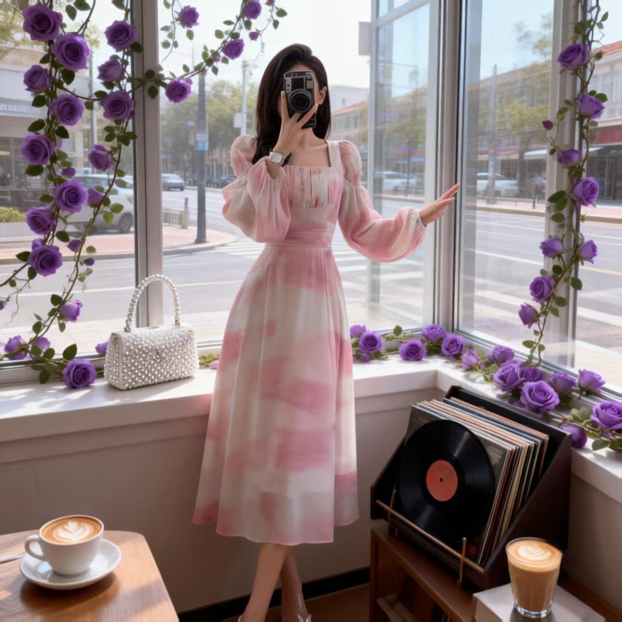 FA55132# 新款温柔法式少女公主风粉色印花长裙度假氛围感雪纺连衣裙 服裝批發女裝批發服飾貨源