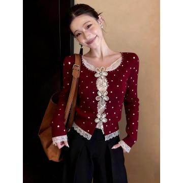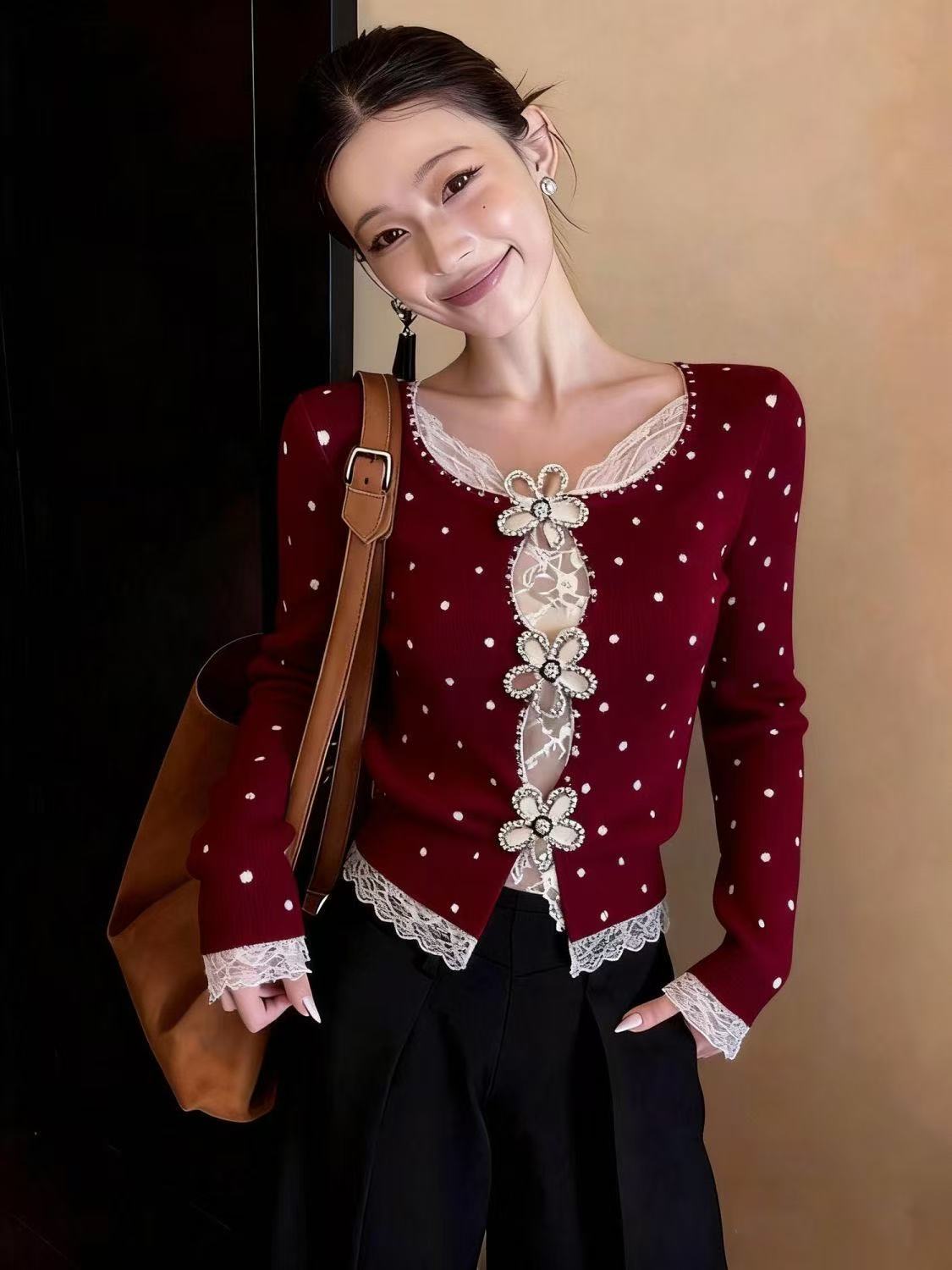 FA55137# 韩系性感穿搭镂空蕾丝拼接长袖女冬季新款修身显瘦波点上衣 服裝批發女裝批發服飾貨源