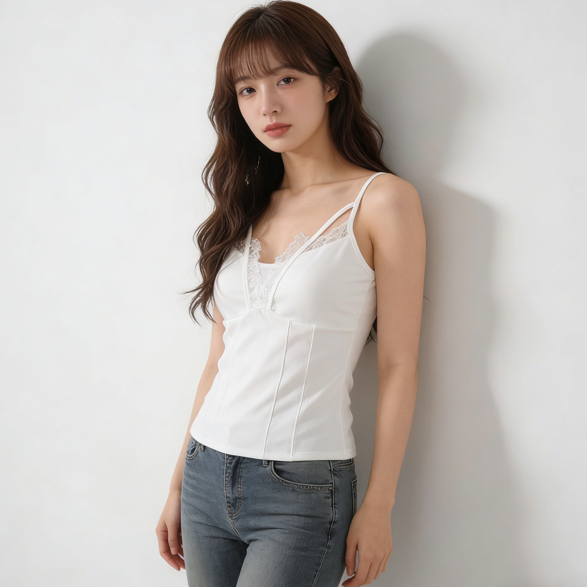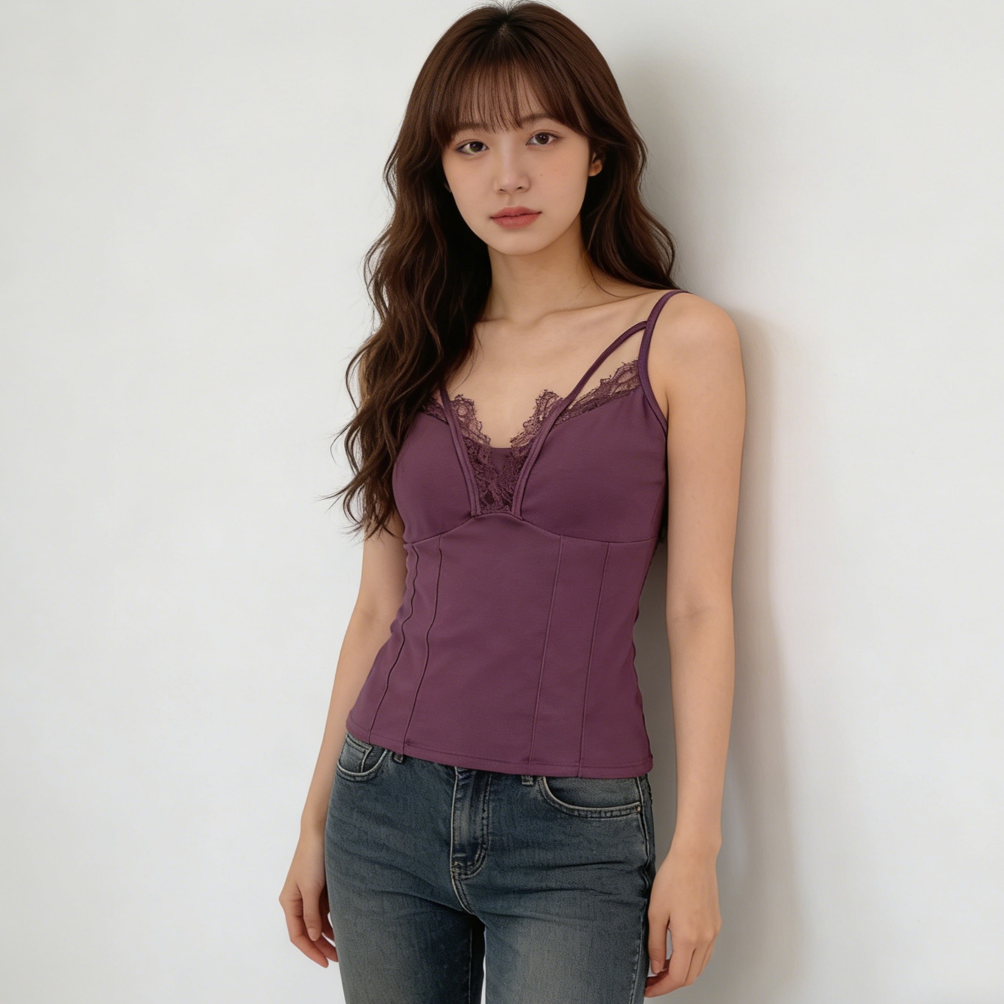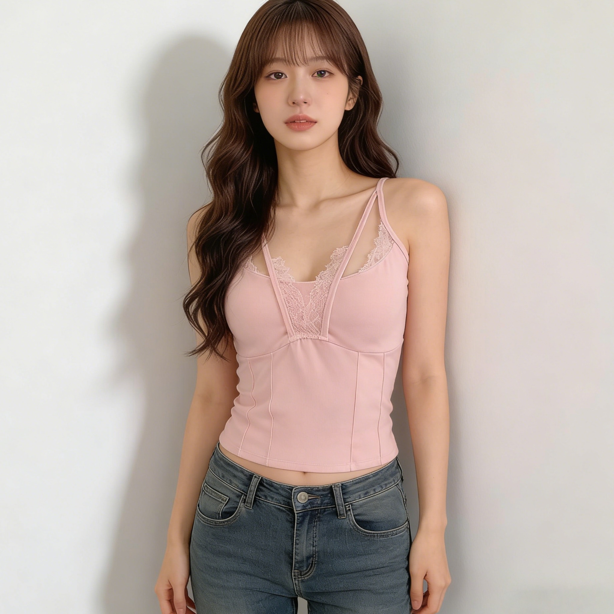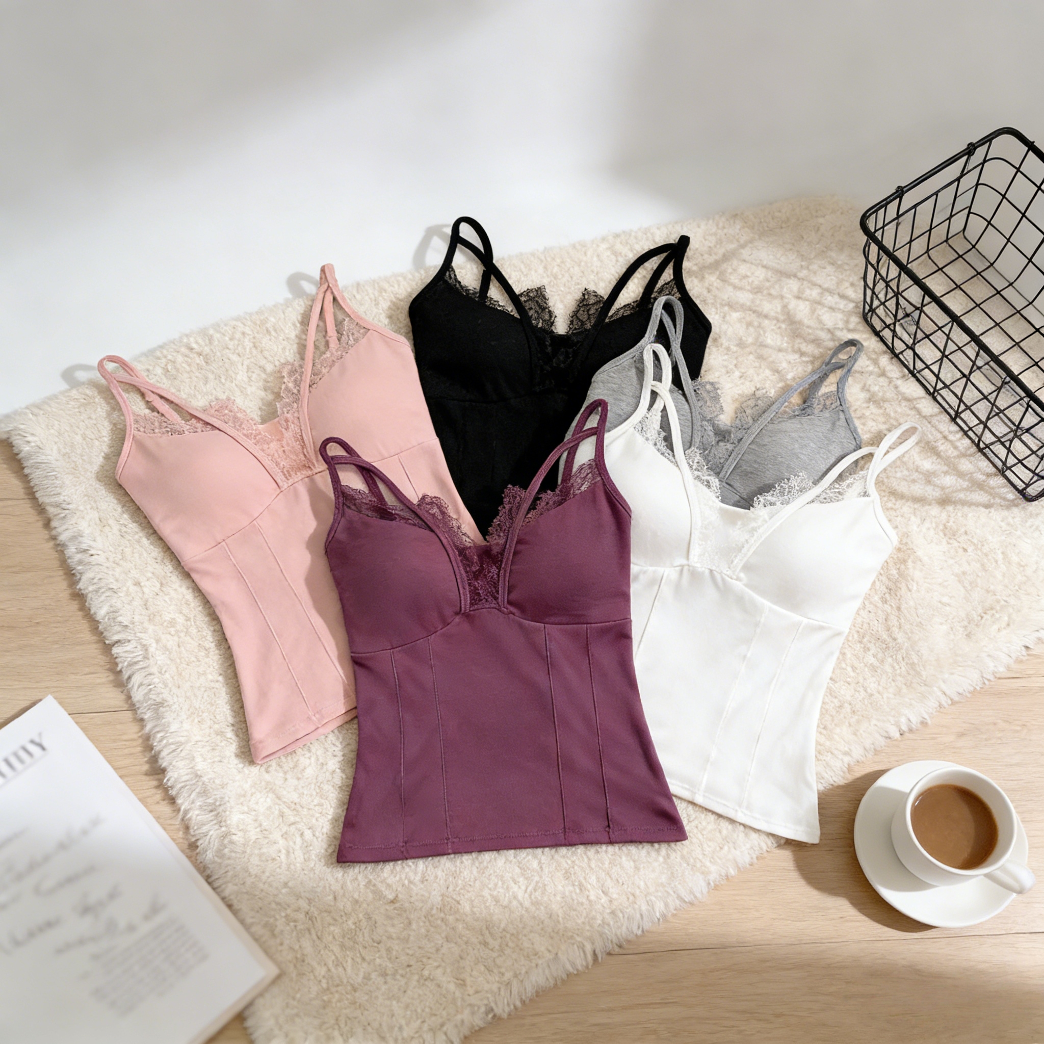 Home > 打底背心、防晒衣、围巾、披肩 > 人棉纯欲蕾丝拼接压褶吊带背心早春辣妹鱼骨修身百搭打底美背 服裝批發女裝批發服飾貨源