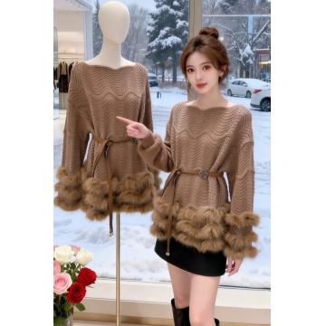法式名媛风洋气腰带收腰针织衫女新款拼接毛毛绝美百搭毛衣裙 服裝批發女裝批發服飾貨源