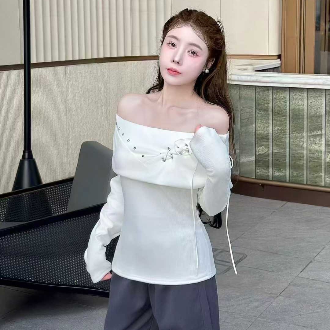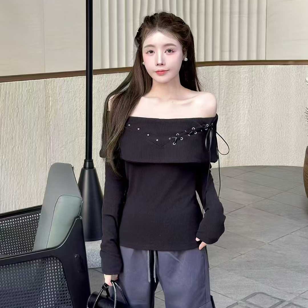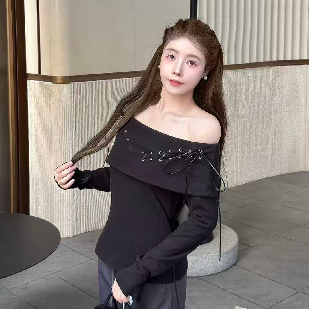 纯欲风甜妹一字肩系带长袖针织衫女春秋季新款时尚减龄显瘦上衣潮 服裝批發女裝批發服飾貨源