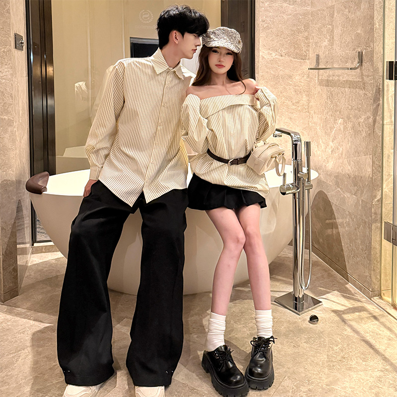 FA55602# 春季新款设计感条纹衬衫情侣装,女衣含腰带 服裝批發女裝批發服飾貨源