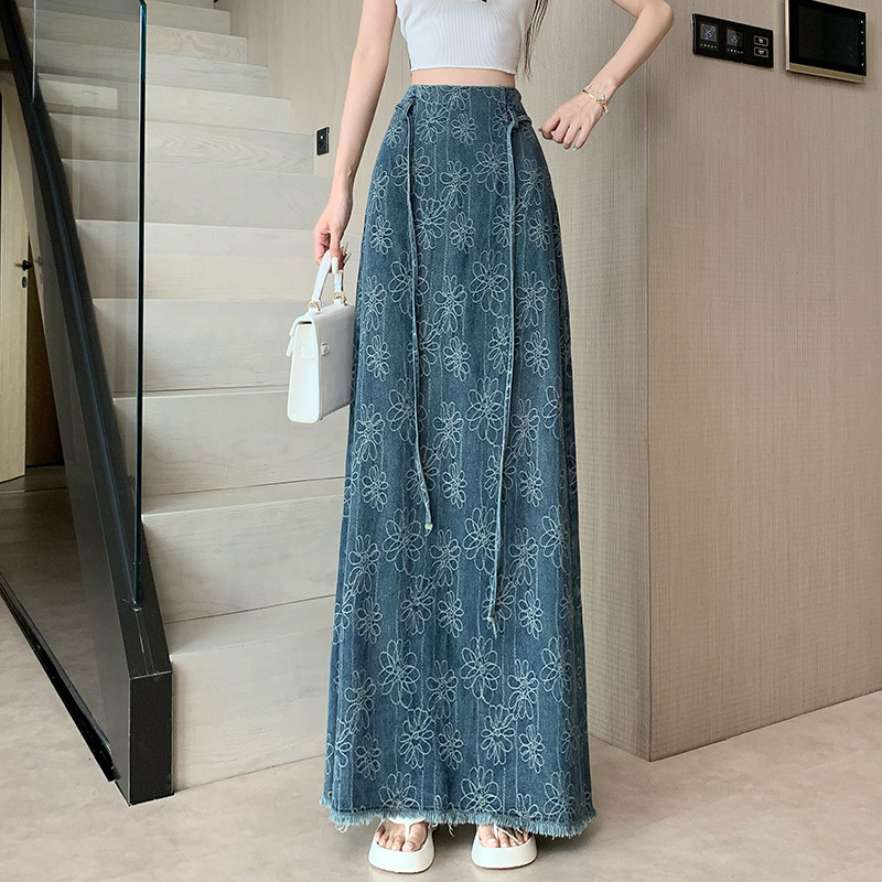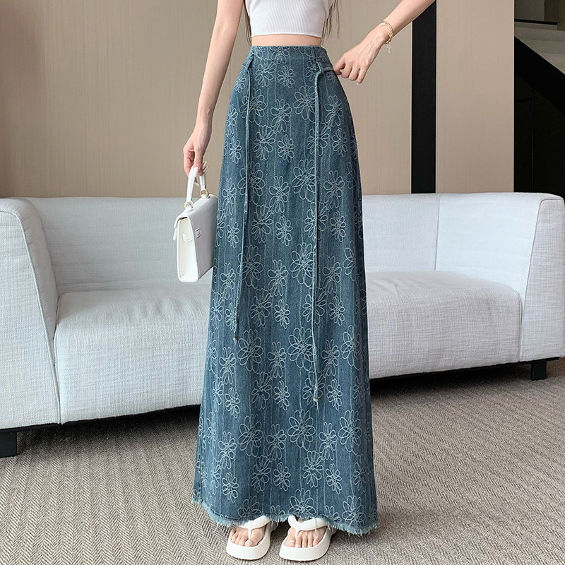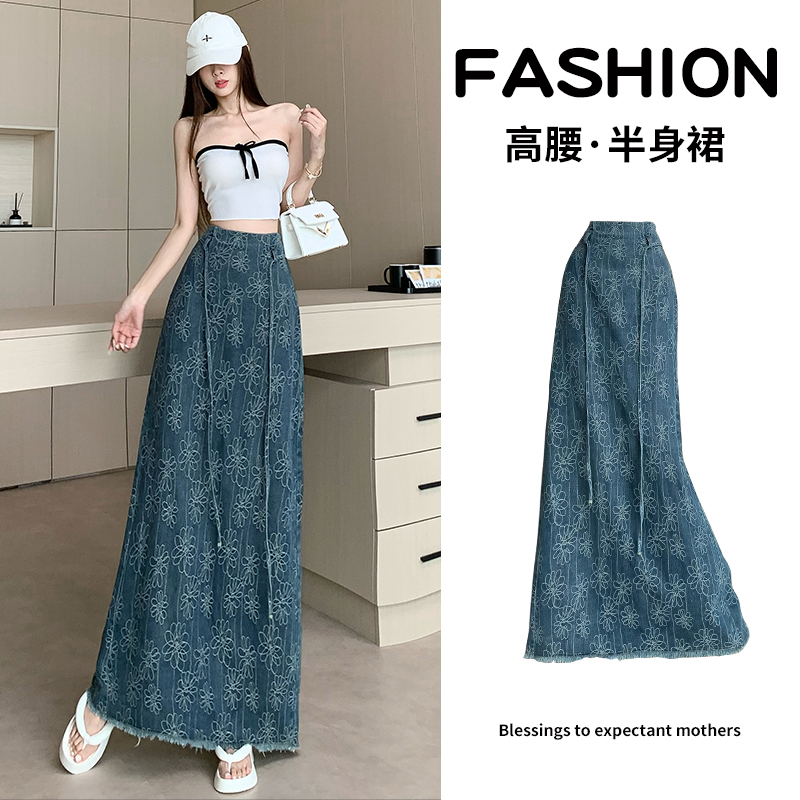 FA55887# 复古提花刺绣牛仔半身裙女夏季系带高腰设计感毛边后开叉包臀长裙 服裝批發女裝批發服飾貨源