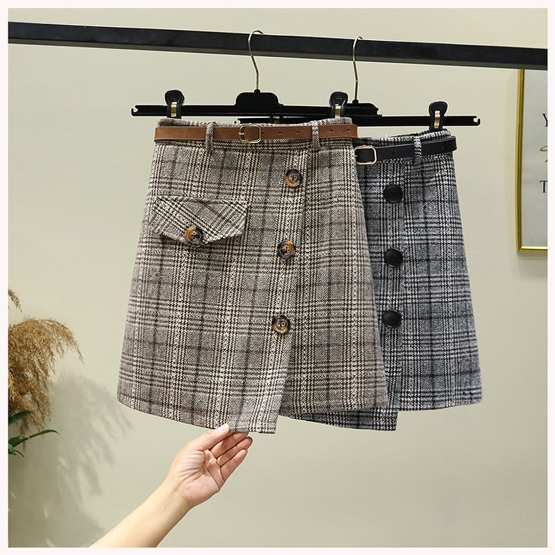 FA55990# 韩版毛呢格子半身裙女秋冬新款排扣不规则a字短裙高腰呢子大码裙 服裝批發女裝批發服飾貨源