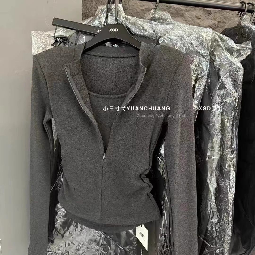 FA56004# 假两件秋冬季韩版百搭时尚百搭纯色显瘦拉链上衣 服裝批發女裝批發服飾貨源