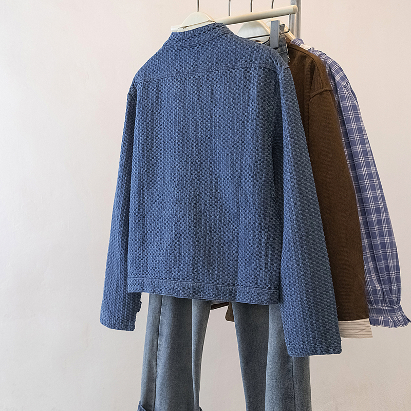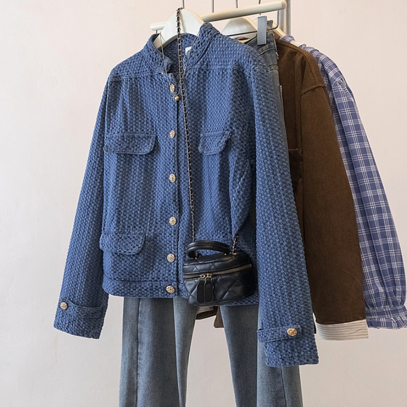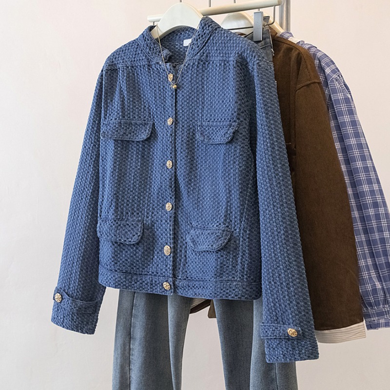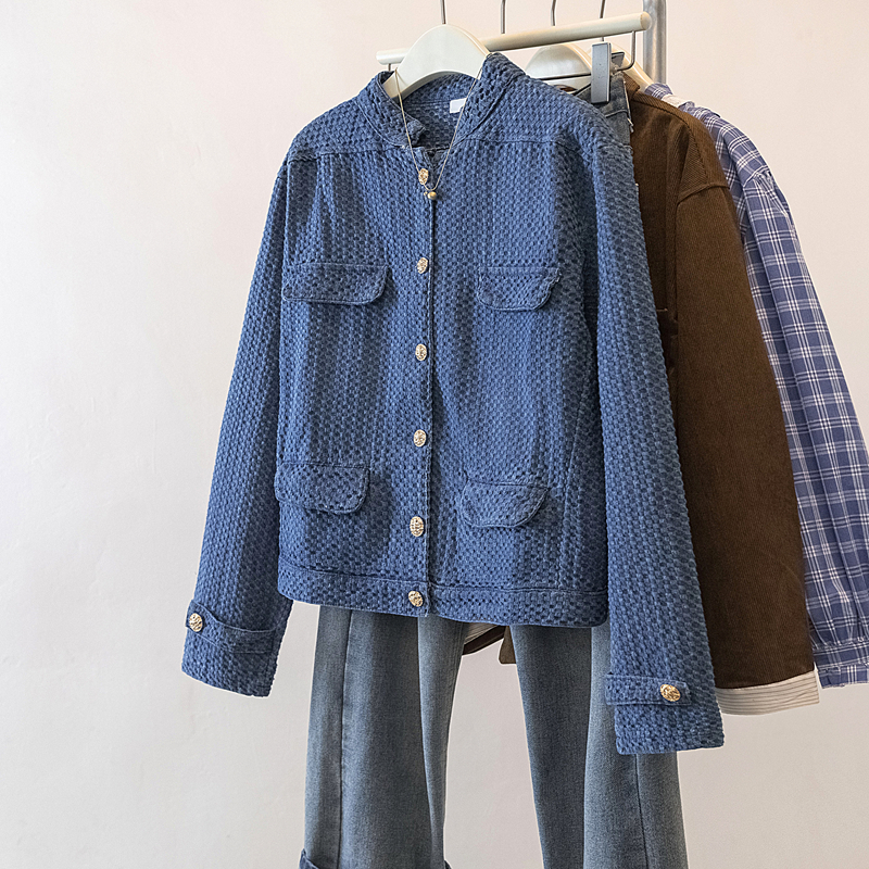 FA56139# 大码春季新款肌理感牛仔小香风外套女蓝色立领夹克上衣 服裝批發女裝批發服飾貨源