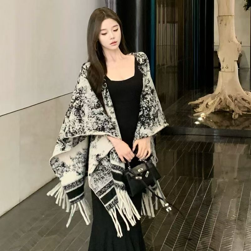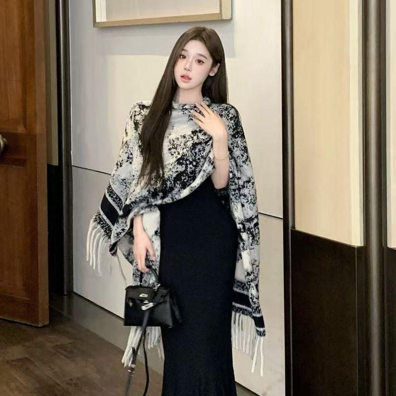 YF6945# 图片色时尚泼墨碎花流苏设计围巾 空调房保暖双面提花斗蓬披肩