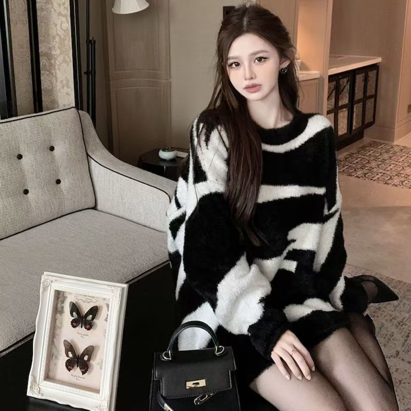 YF6957# 图片色韩版冬装不规则黑白提花海马毛长袖圆领宽松大码通勤毛衣