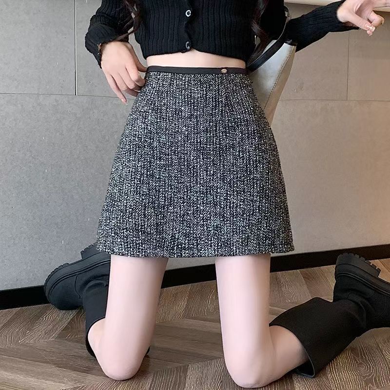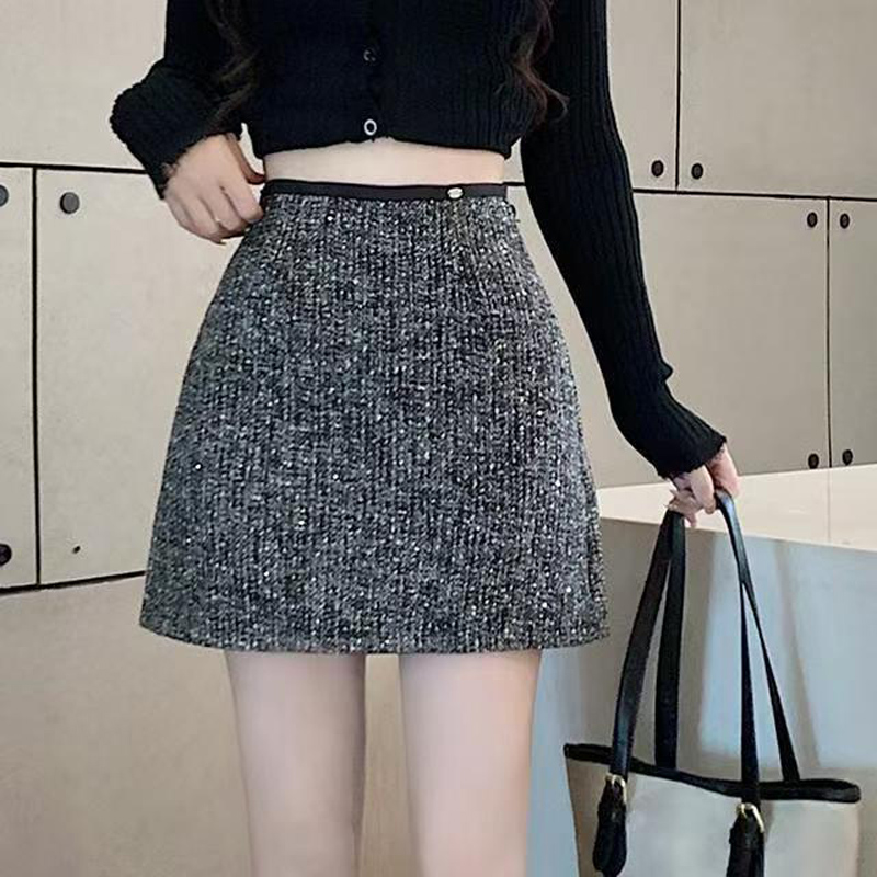 YF7001# 图片色秋冬亮片粗毛呢设计A字包臀显瘦韩版复古小香风半身裙