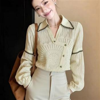 YF7012# 图片色春秋别致设计提花翻领长袖宽松显瘦韩版新款复古气质上衣