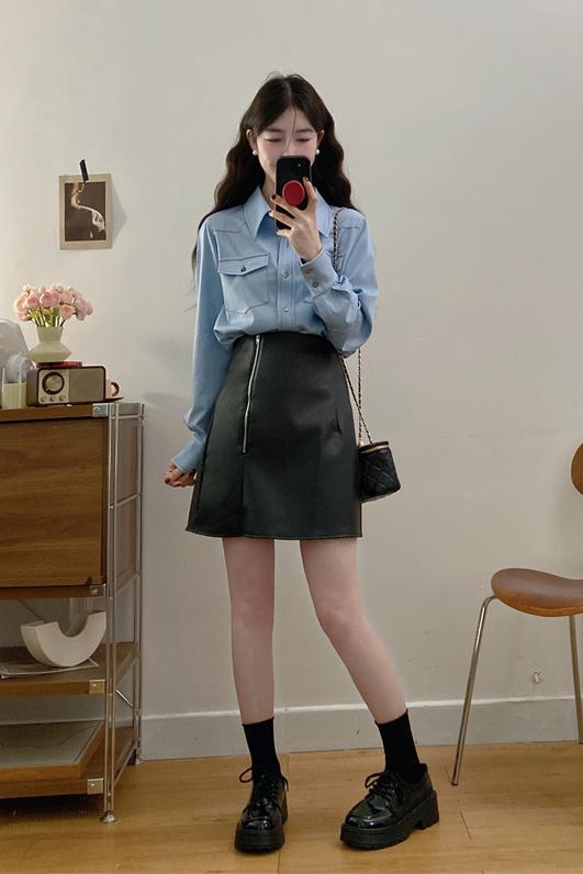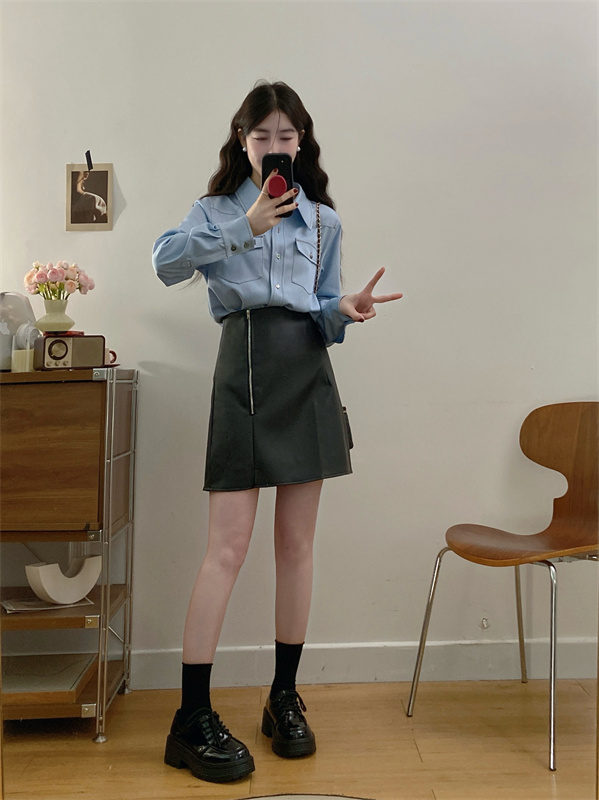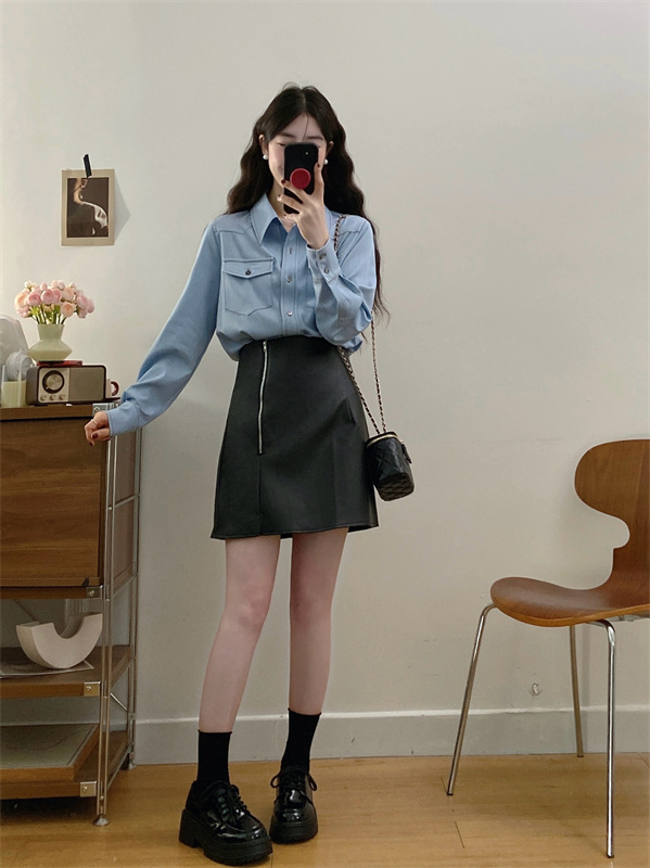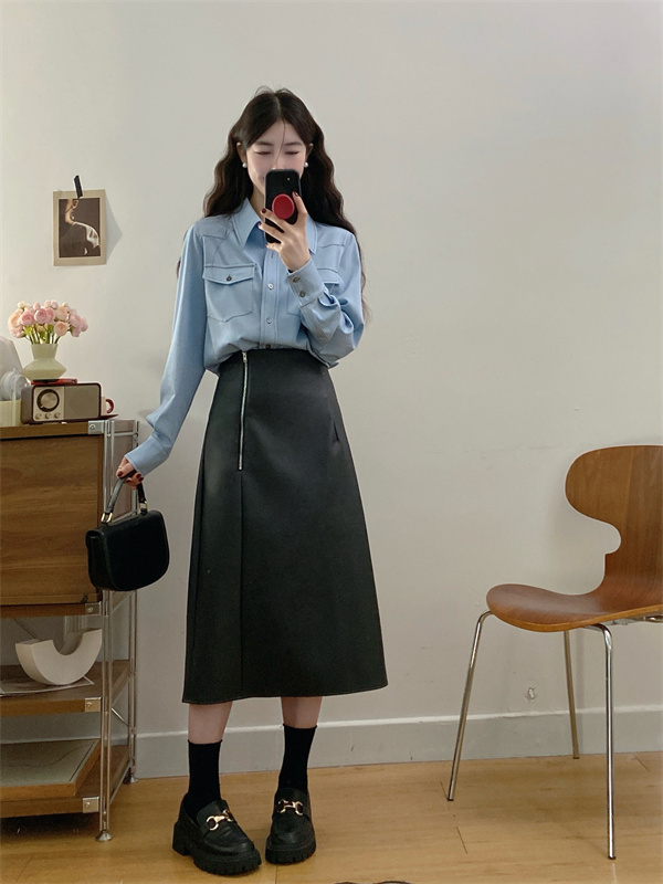 Home > 韩版套装 > FA56336#大码女装胖mm新款长袖复古假牛仔衬衣+黑色气质皮裙 服裝批發女裝批發服飾貨源