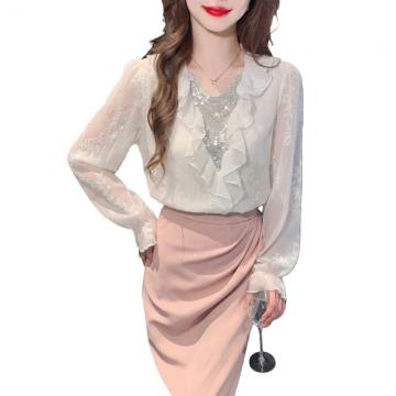 FA56364#春季时尚设计感荷叶边v领雪纺衫女宽松气质好看漂亮上衣 服裝批發女裝批發服飾貨源