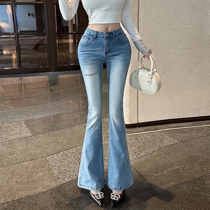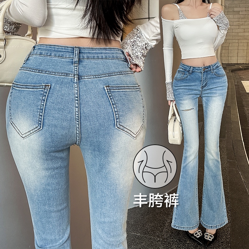 FA56529# 花三三同款SANSAN韩代GUSE春款自带丰胯一字破洞微喇牛仔裤 服裝批發女裝批發服飾貨源