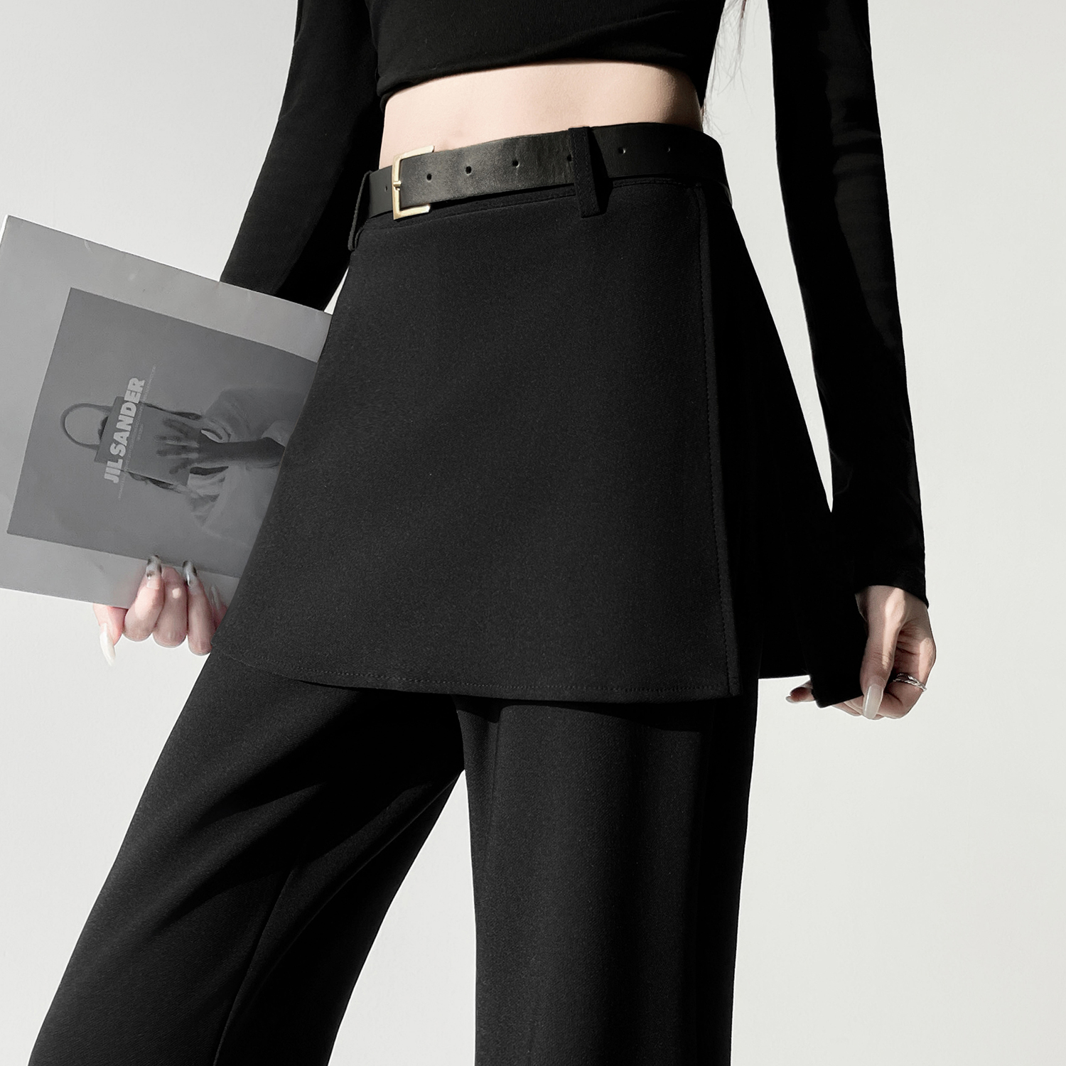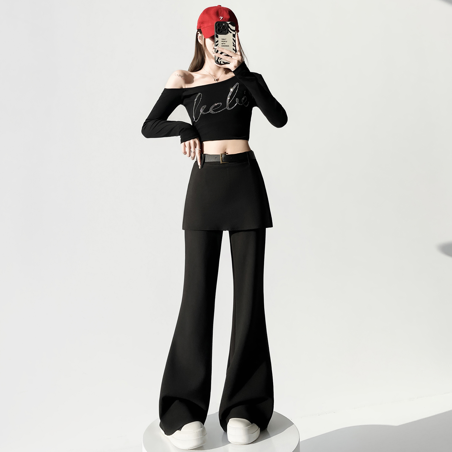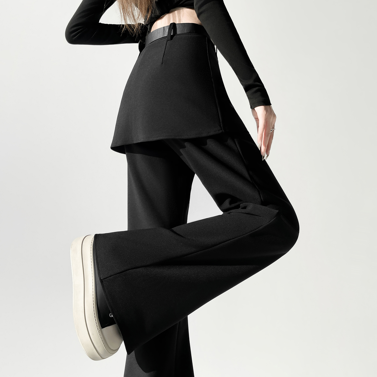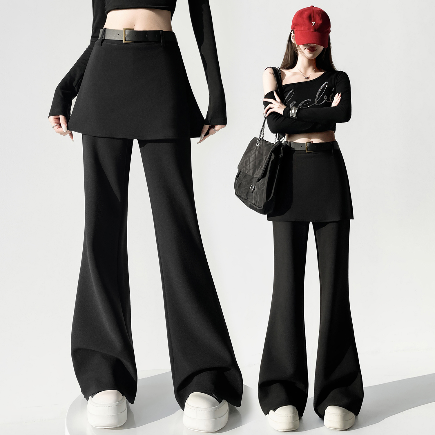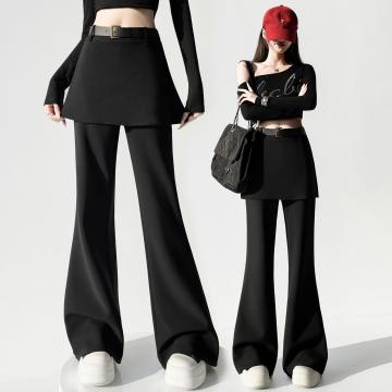 FA56571# 黑色假俩件屁帘微喇裤女春季新款高腰显瘦设计感喇叭裤子 服裝批發女裝批發服飾貨源