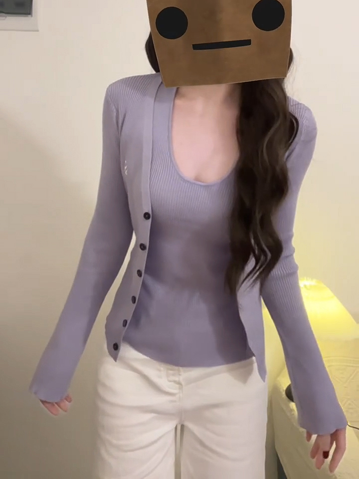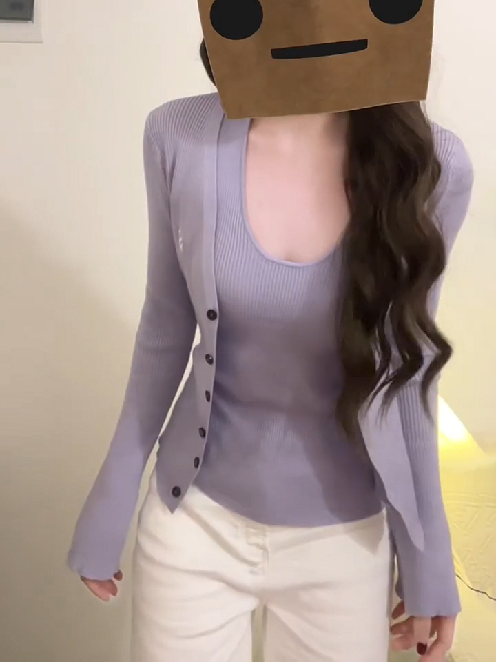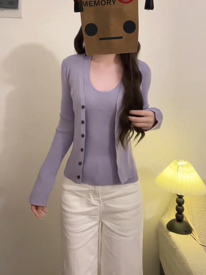 FA56623# 春秋针织开衫外套女长袖薄款挂脖背心紫色设计感两件套装 服裝批發女裝批發服飾貨源