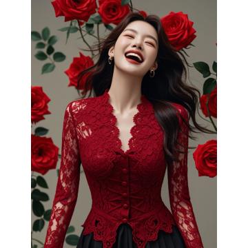 FA56626# 别致红色蕾丝上衣小衫修身内搭高级感洋气时髦法式长袖气质打底衫 服裝批發女裝批發服飾貨源