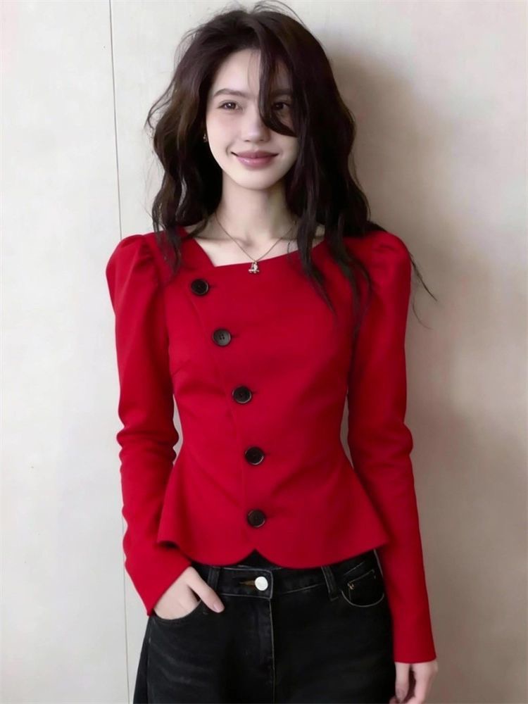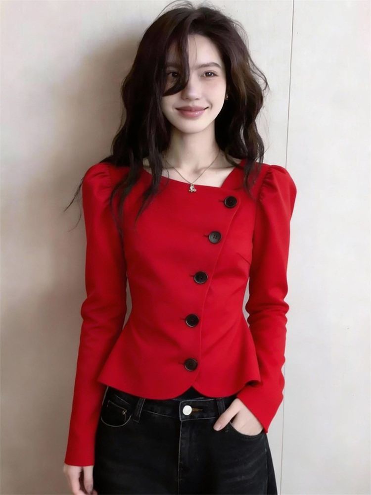 FA56629# 轻奢风红色泡泡袖排扣上衣通勤显白气质多纽扣设计春季新款女 服裝批發女裝批發服飾貨源