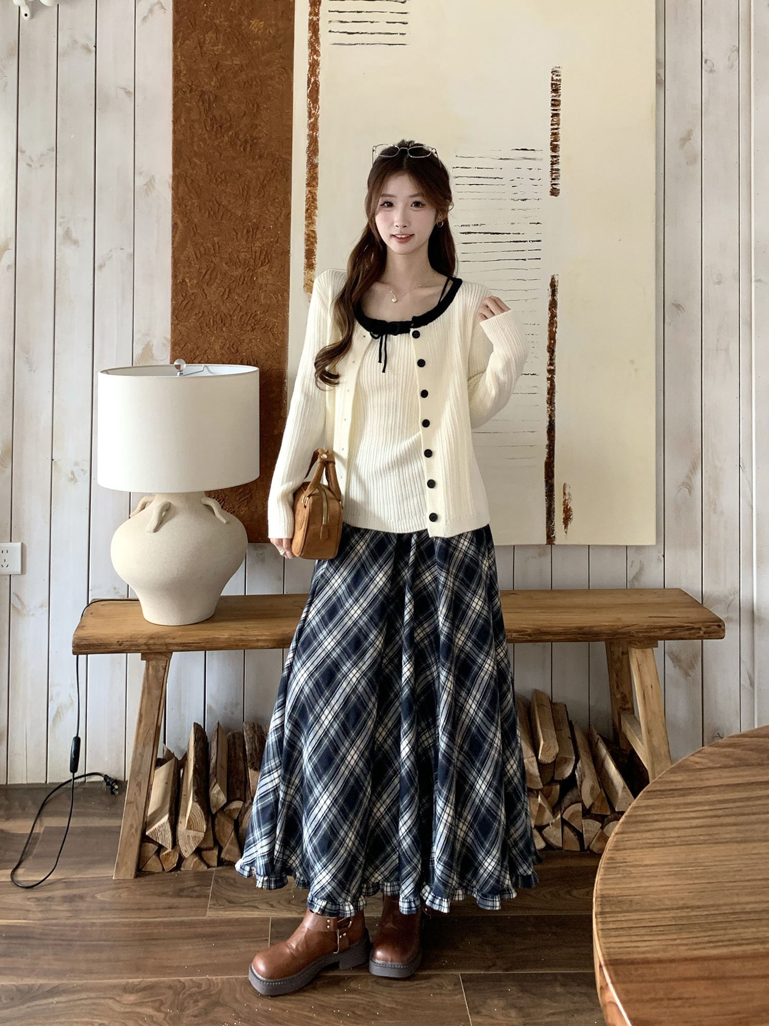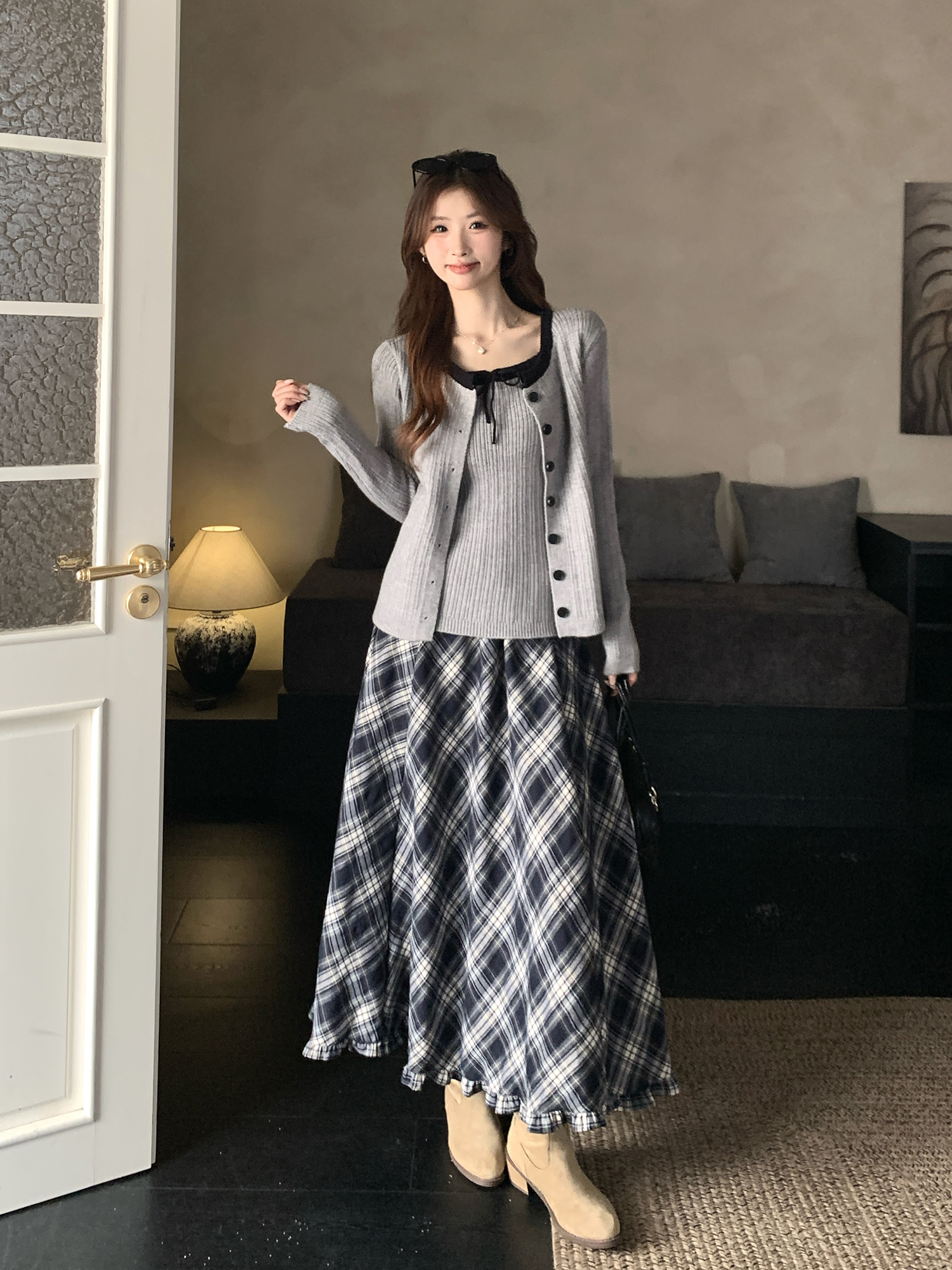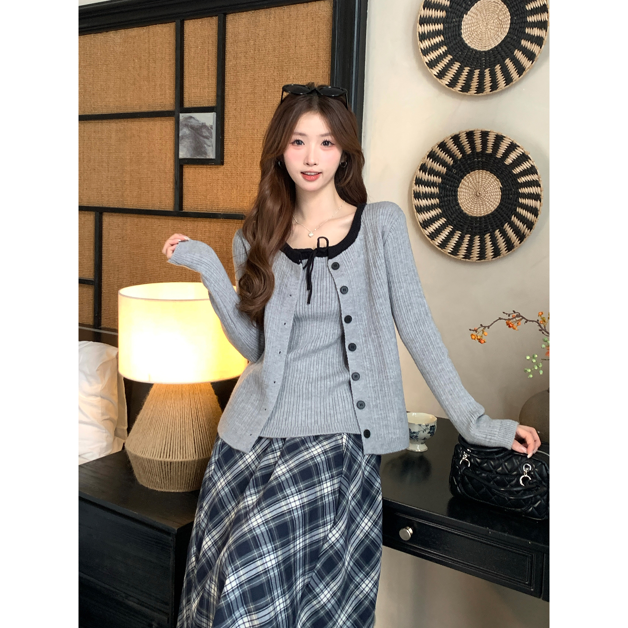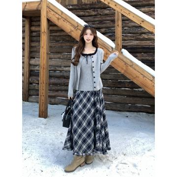 FA56633# 温柔风秋冬新款设计感软糯毛衣外套小吊带复工格纹半身裙 服裝批發女裝批發服飾貨源