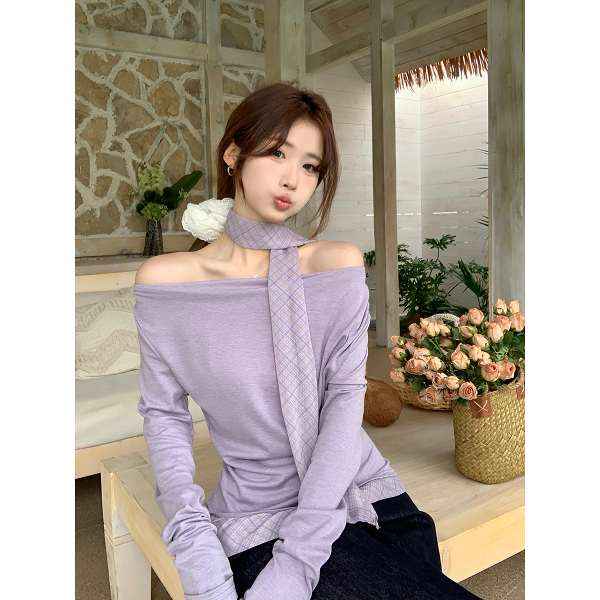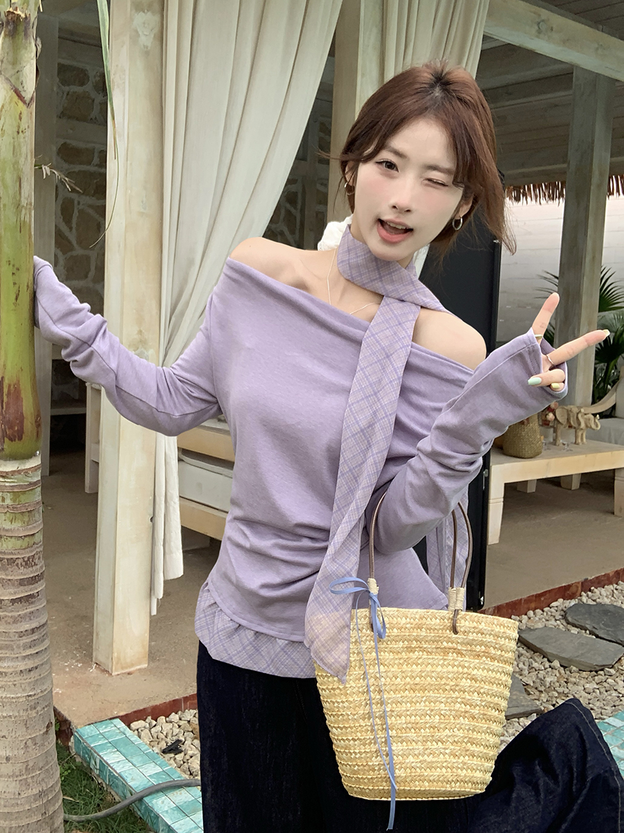 FA56635# 韩式假两件上衣设计感格纹拼接配丝巾别致叠穿打底T恤 服裝批發女裝批發服飾貨源