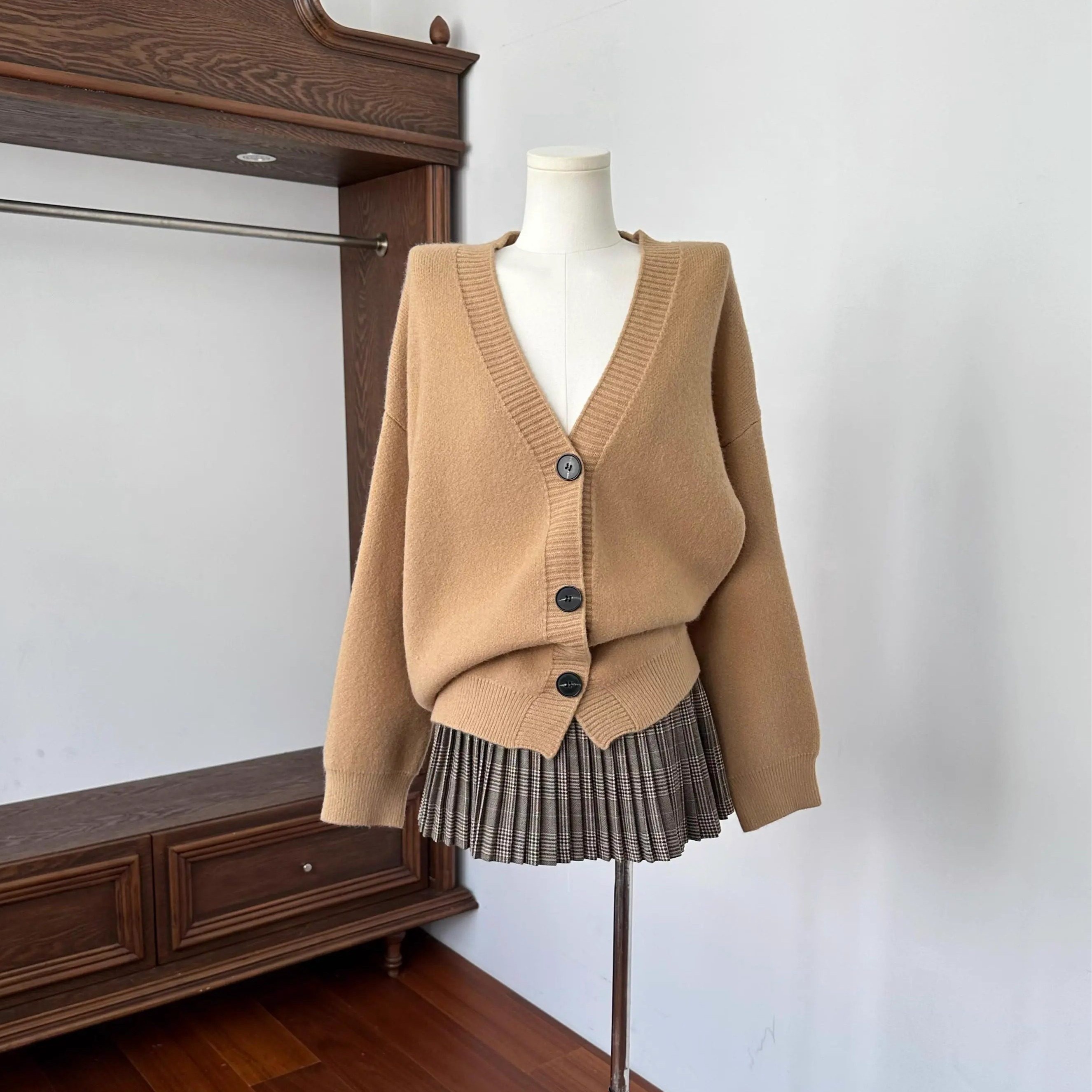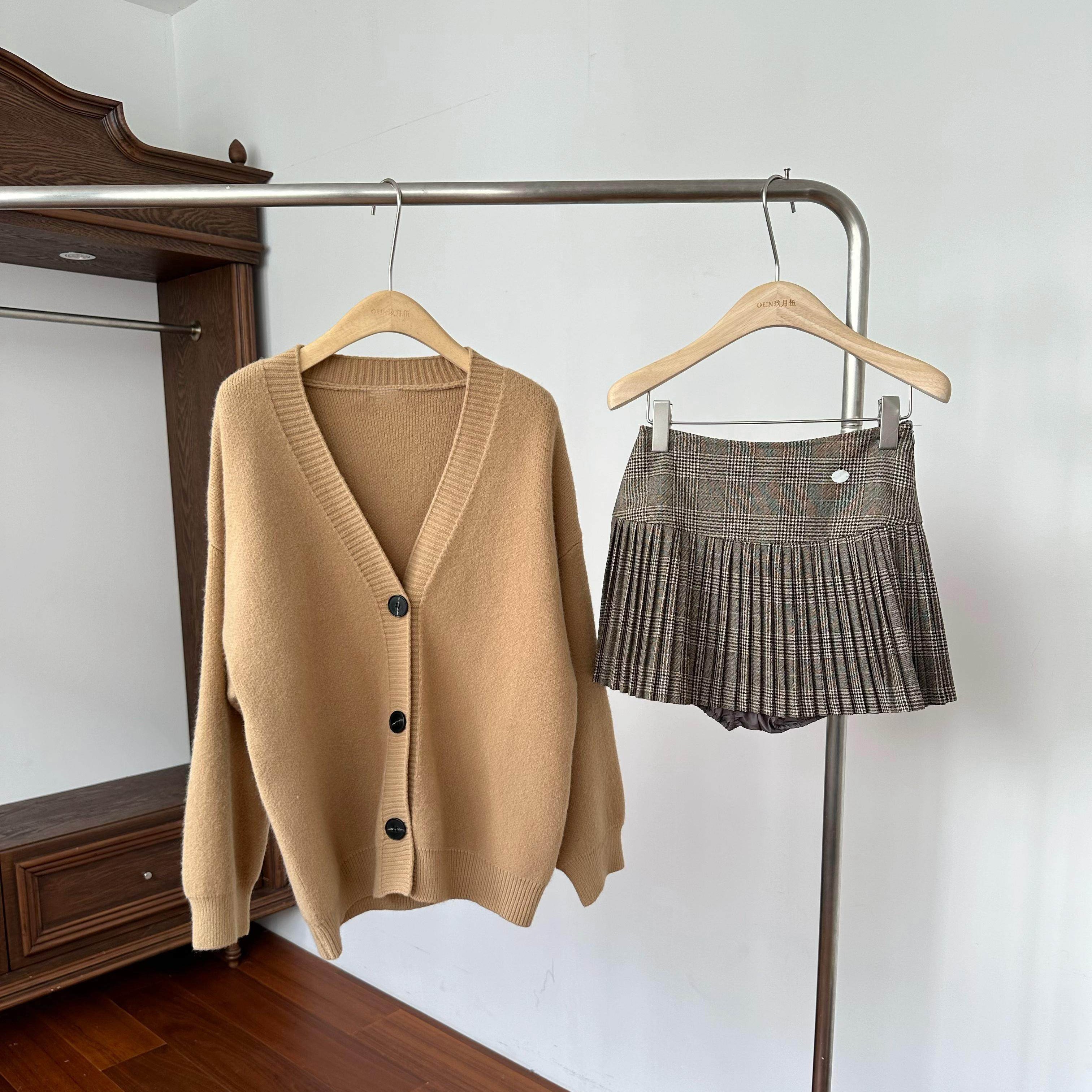 FA56689# 藤校学院风套装卡其针织开衫外套毛衣复古百褶半裙两件套 服裝批發女裝批發服飾貨源