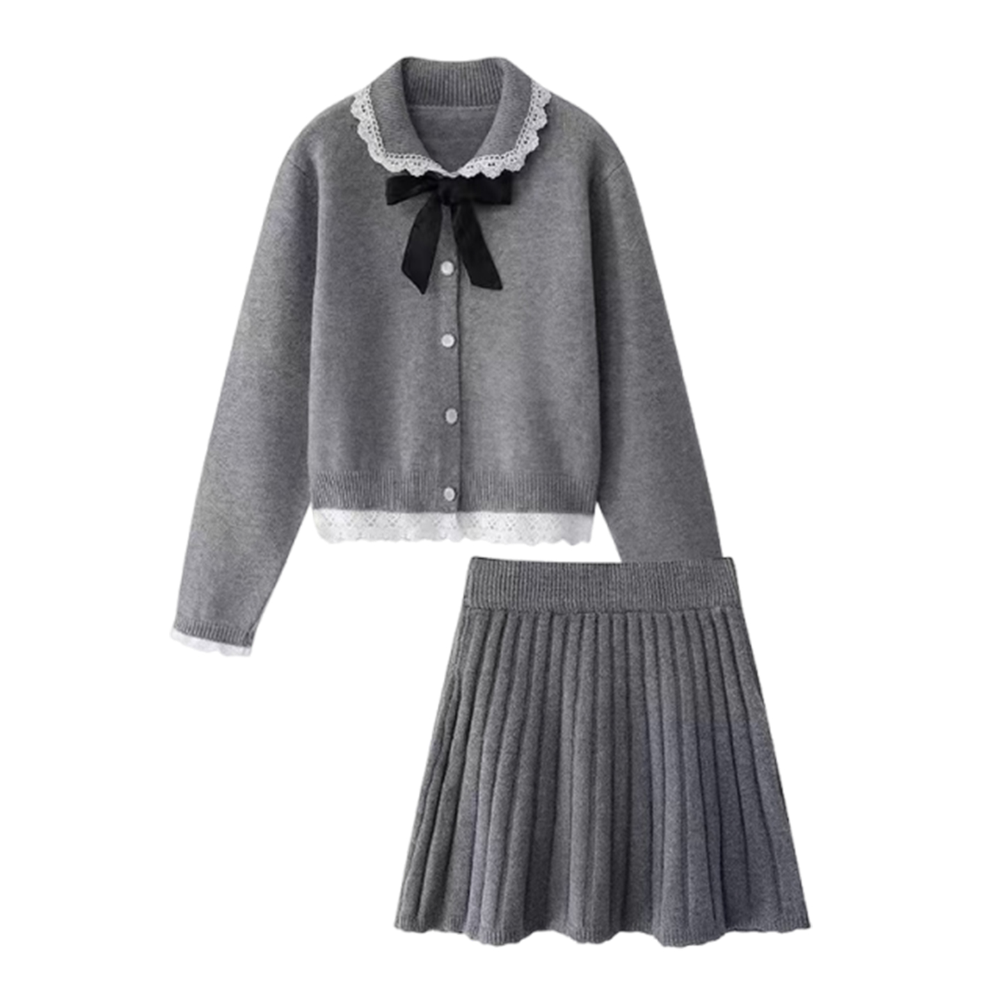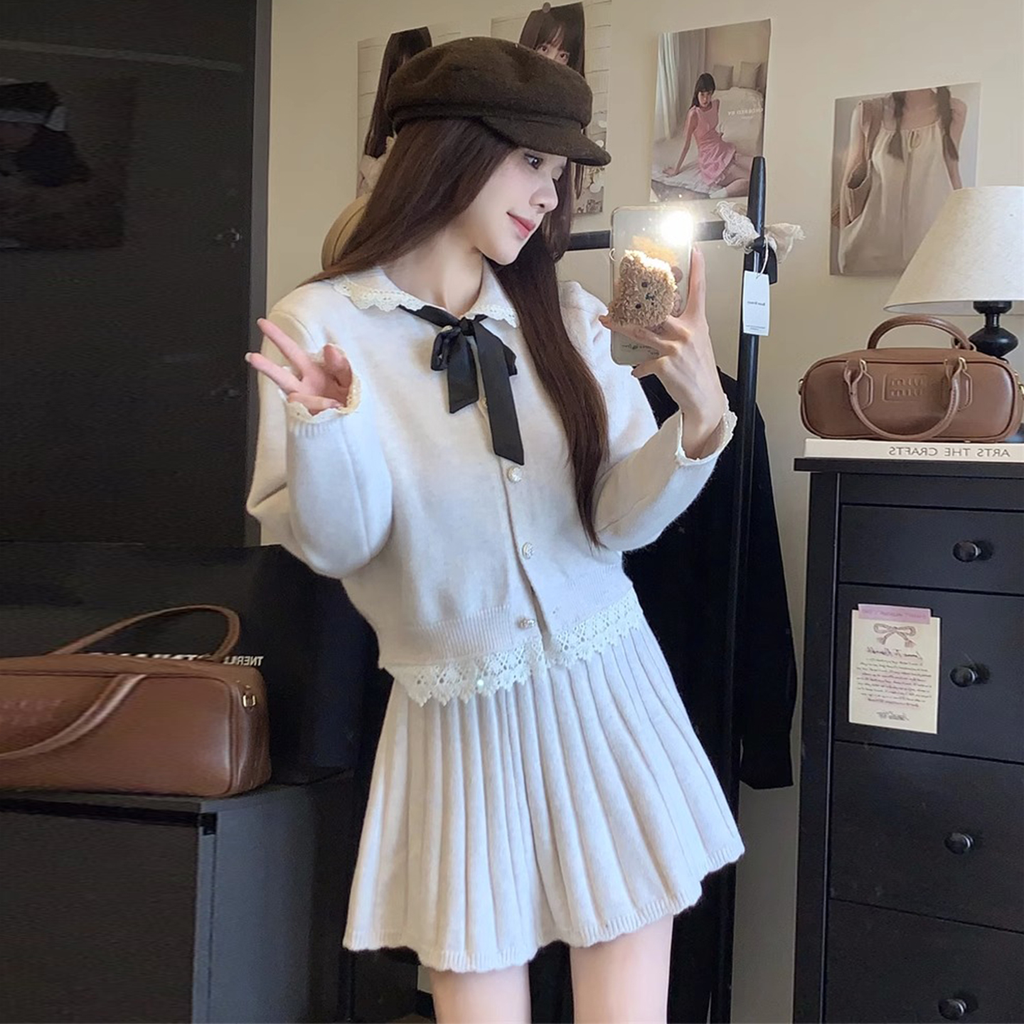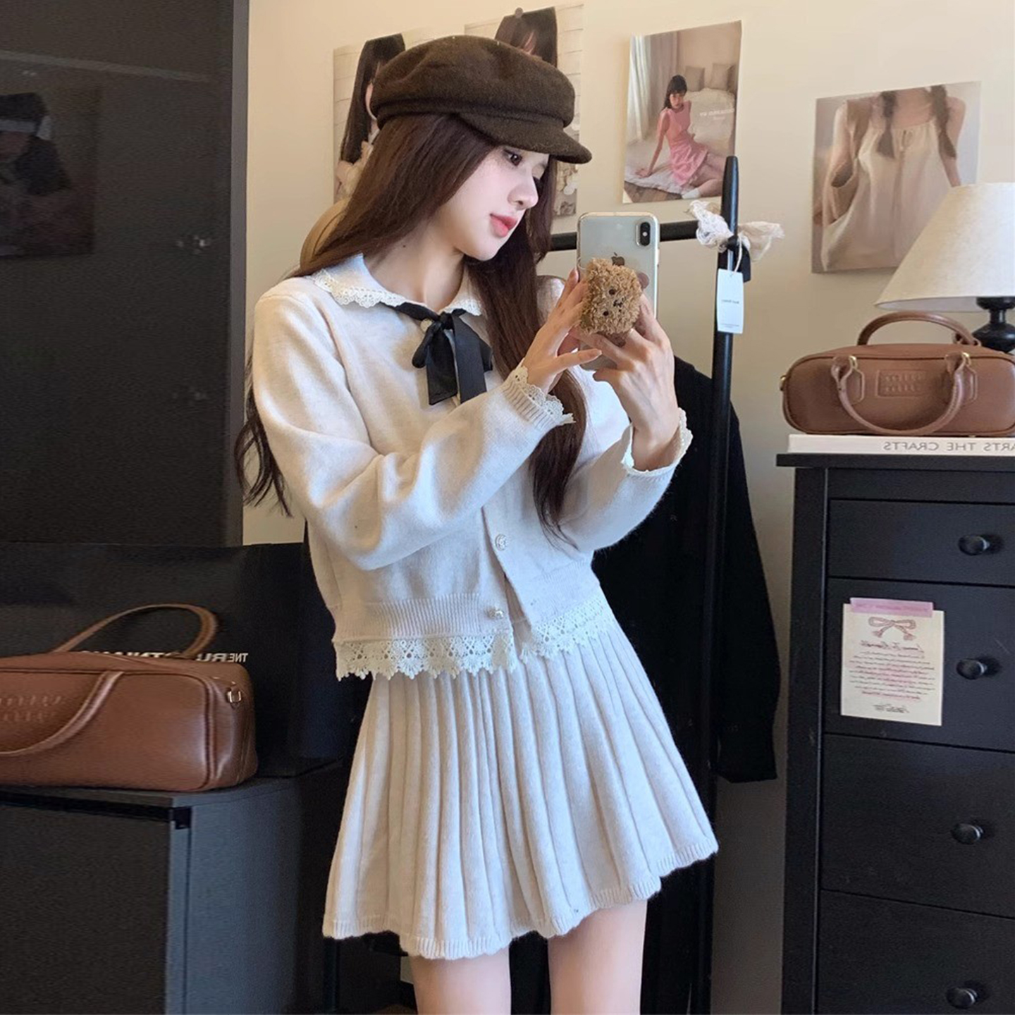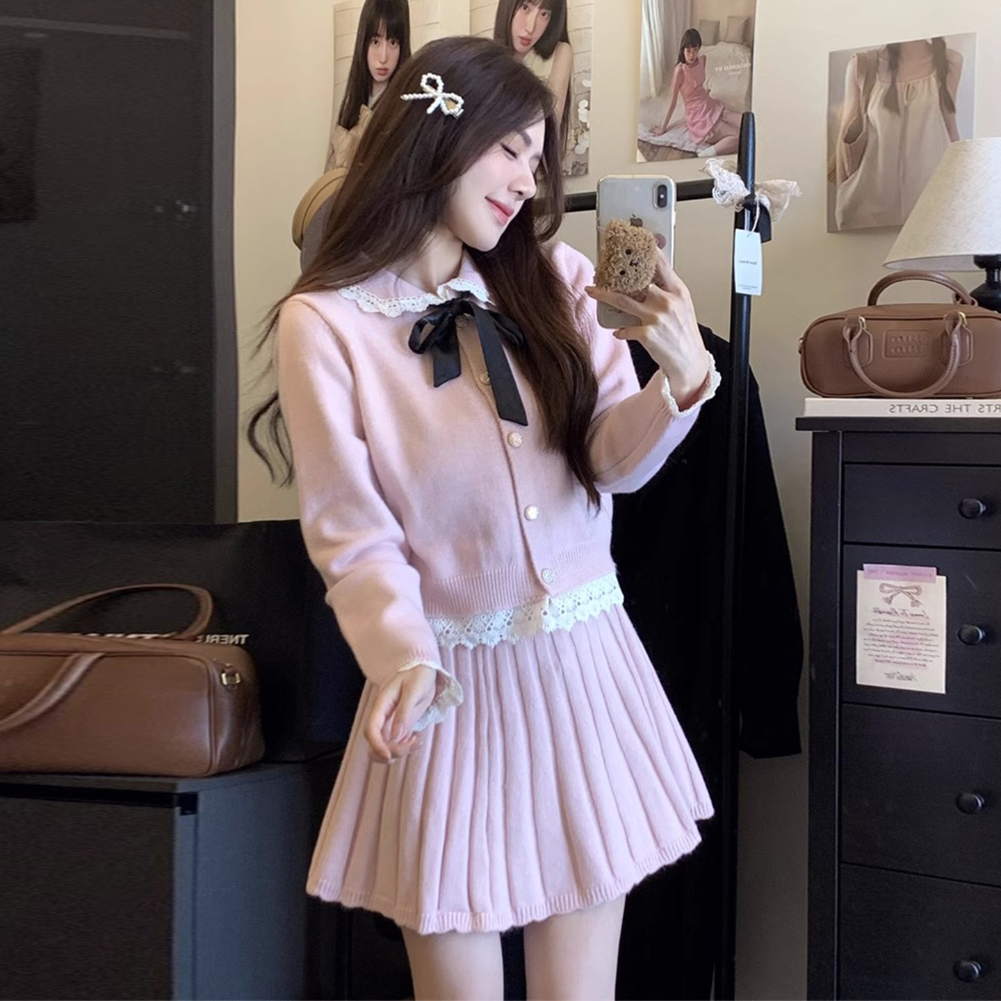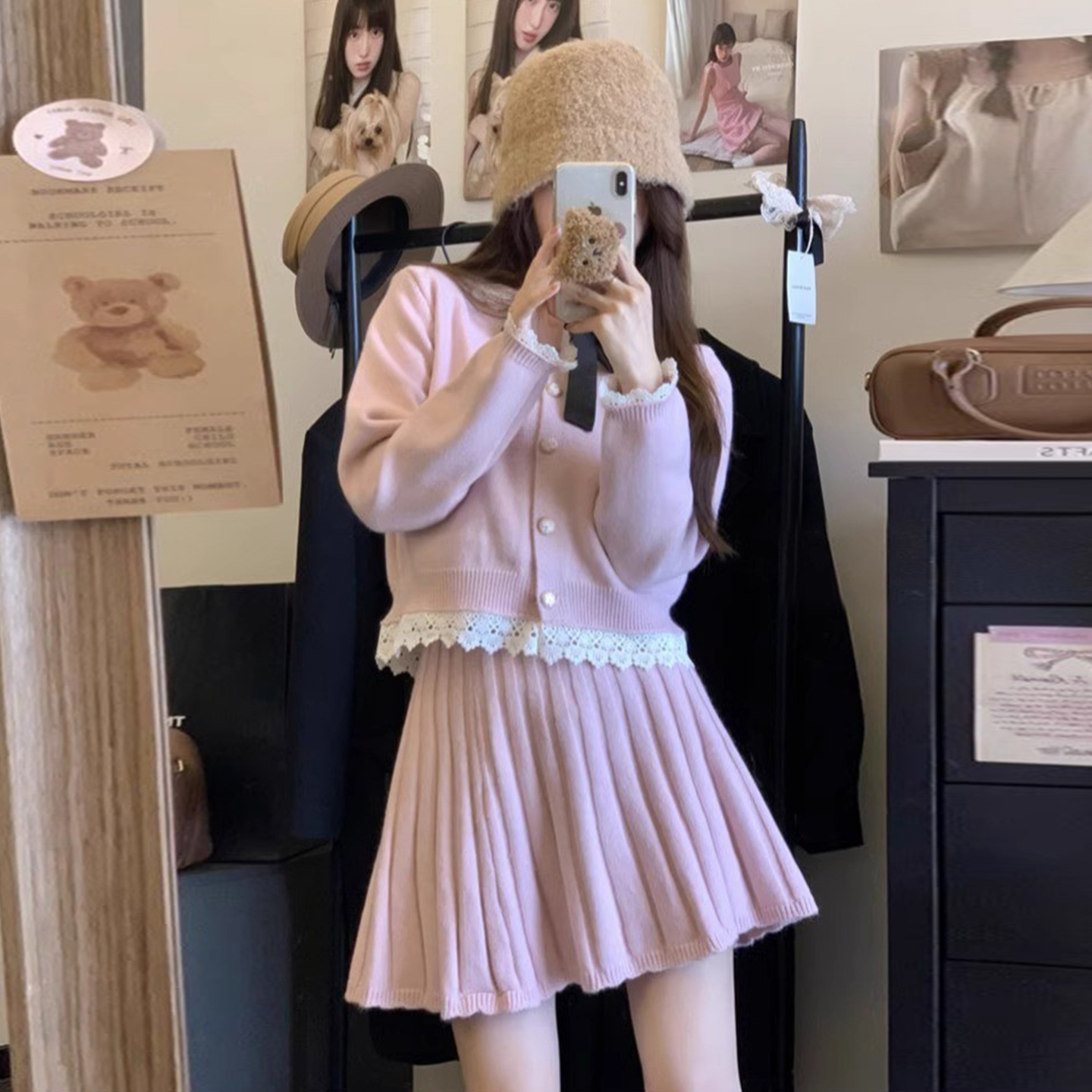 FA56716# 小个子香风粉色蕾丝针织毛衣连衣裙女秋冬季新款韩系绝美套装 服裝批發女裝批發服飾貨源