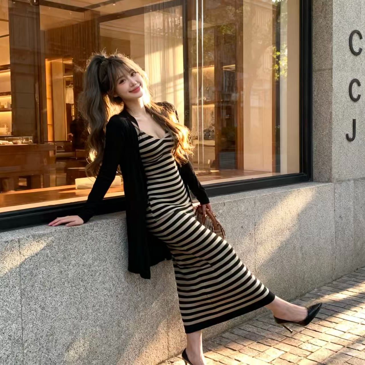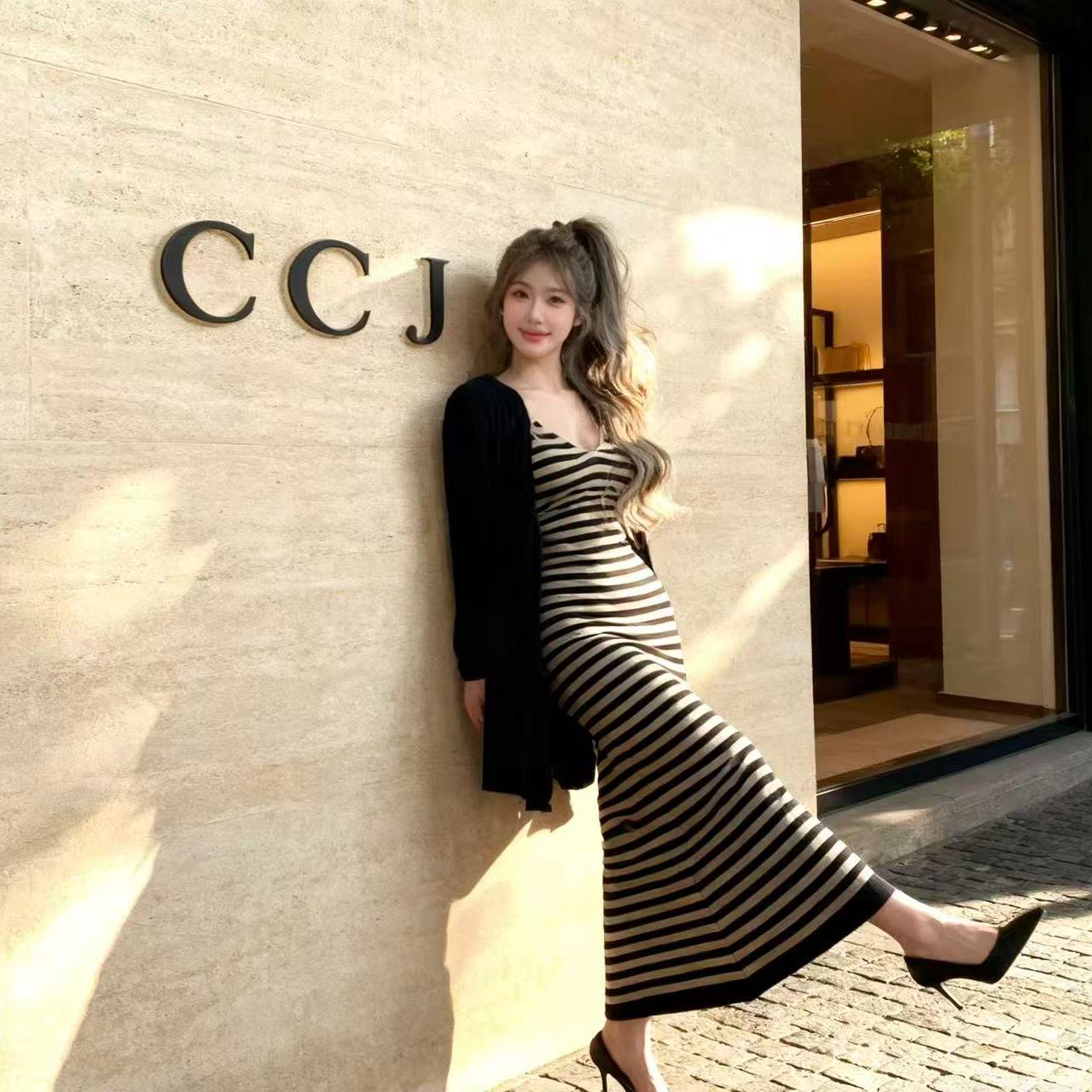 FA56759# 法式复古条纹吊带裙套装女夏季长袖防晒开衫纯欲V领收腰包臀长裙 服裝批發女裝批發服飾貨源