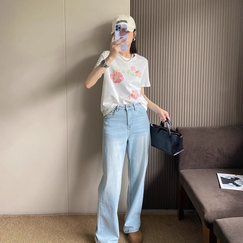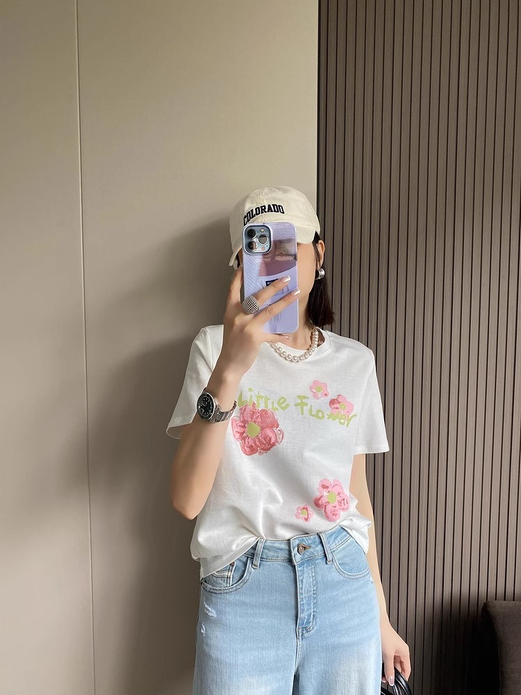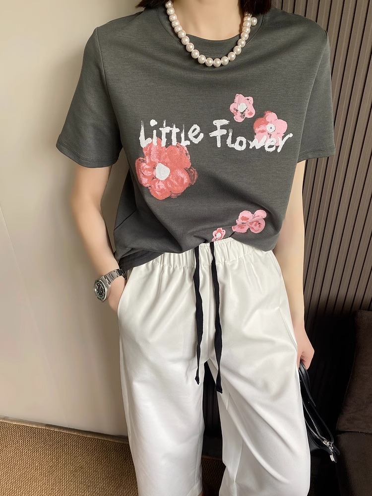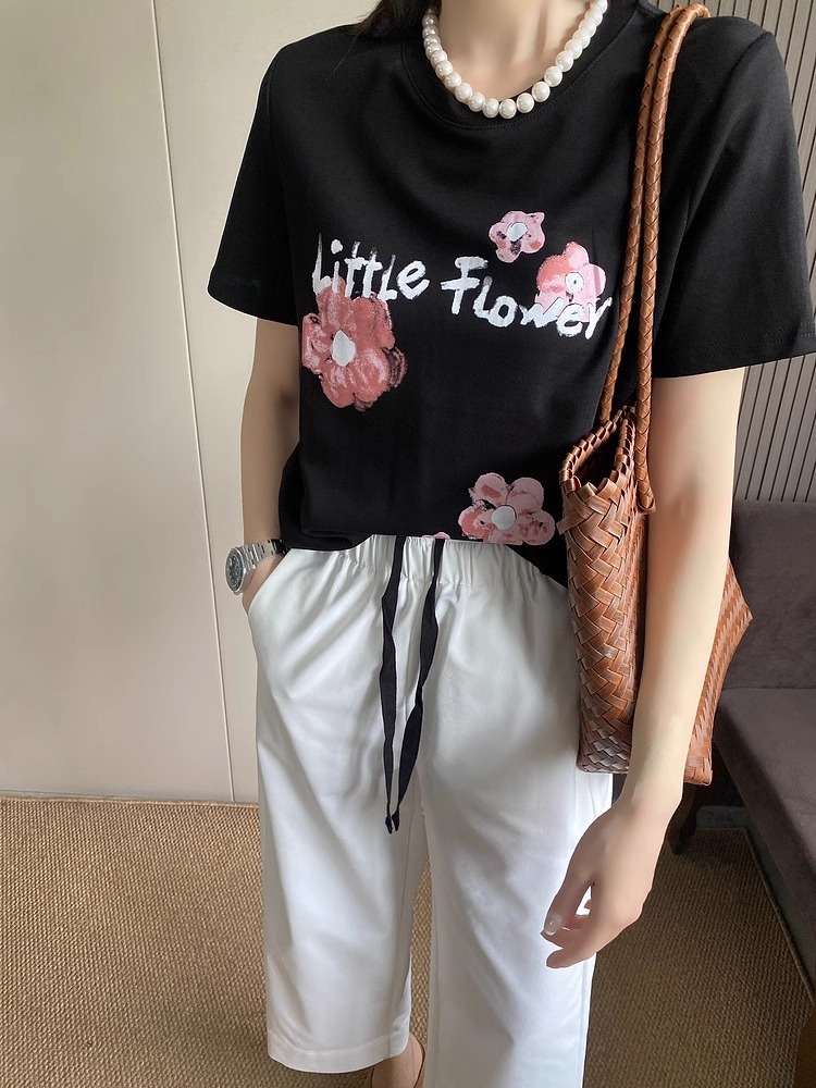 BY10100# 纯棉字母花朵印花短袖T恤女 服裝批發女裝批發服飾貨源