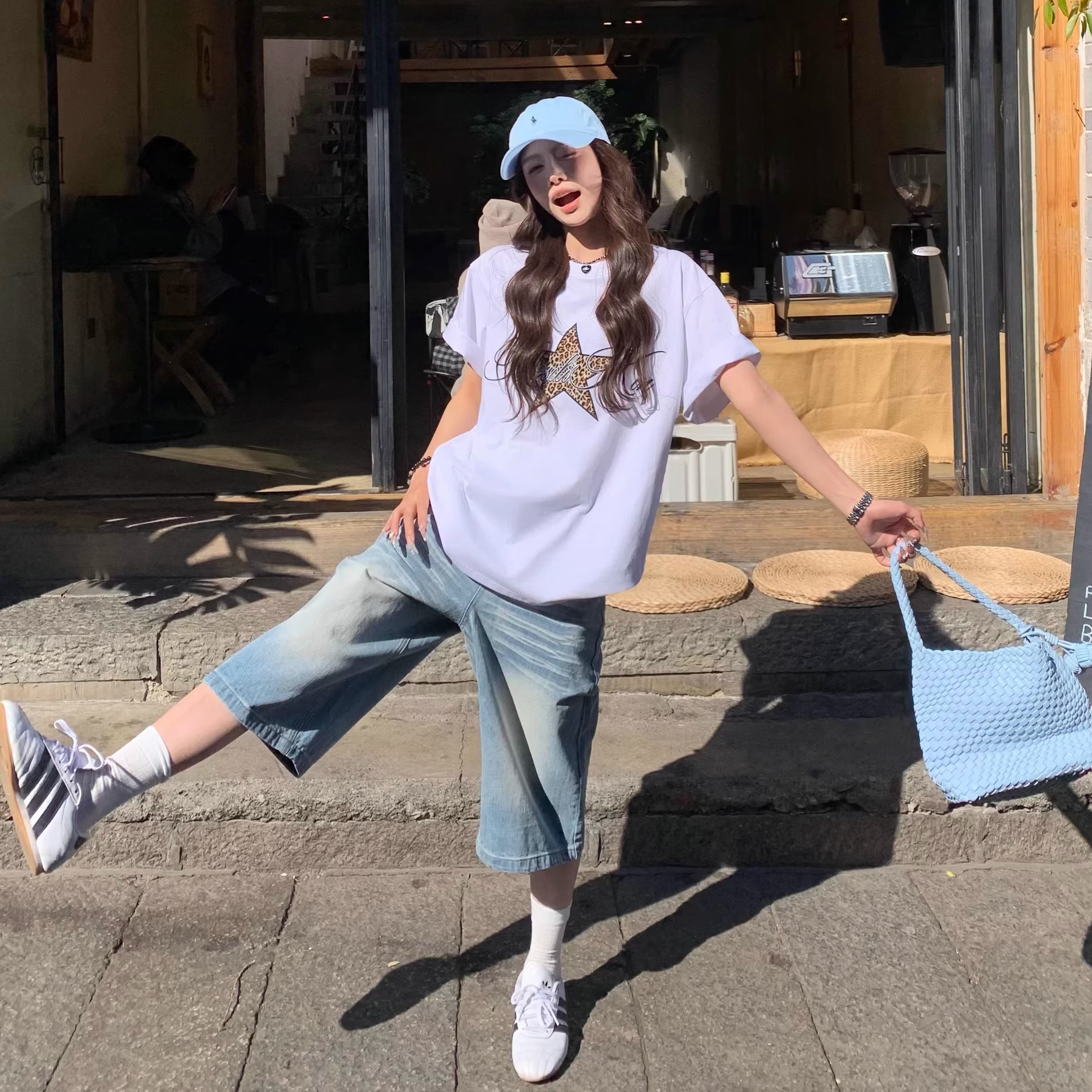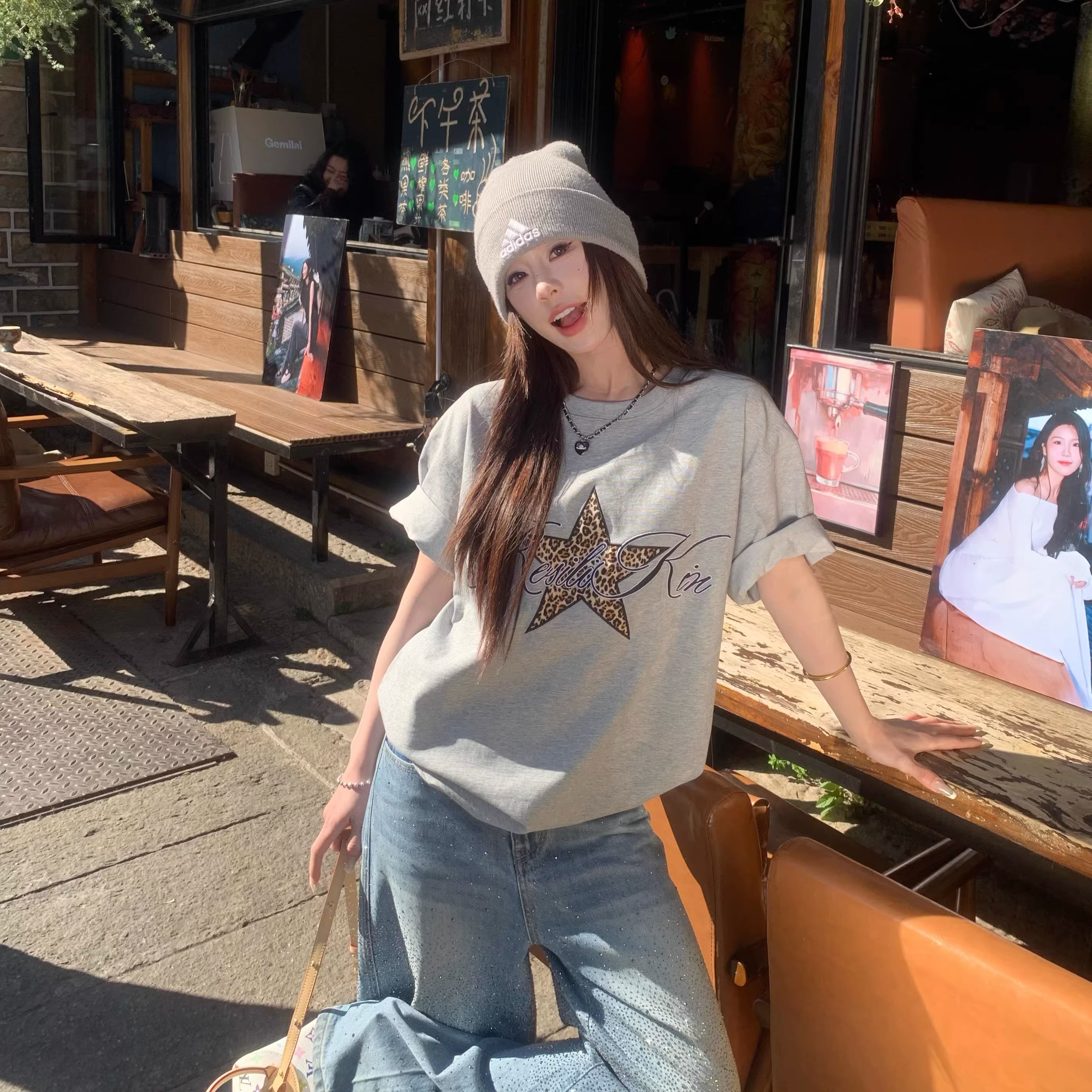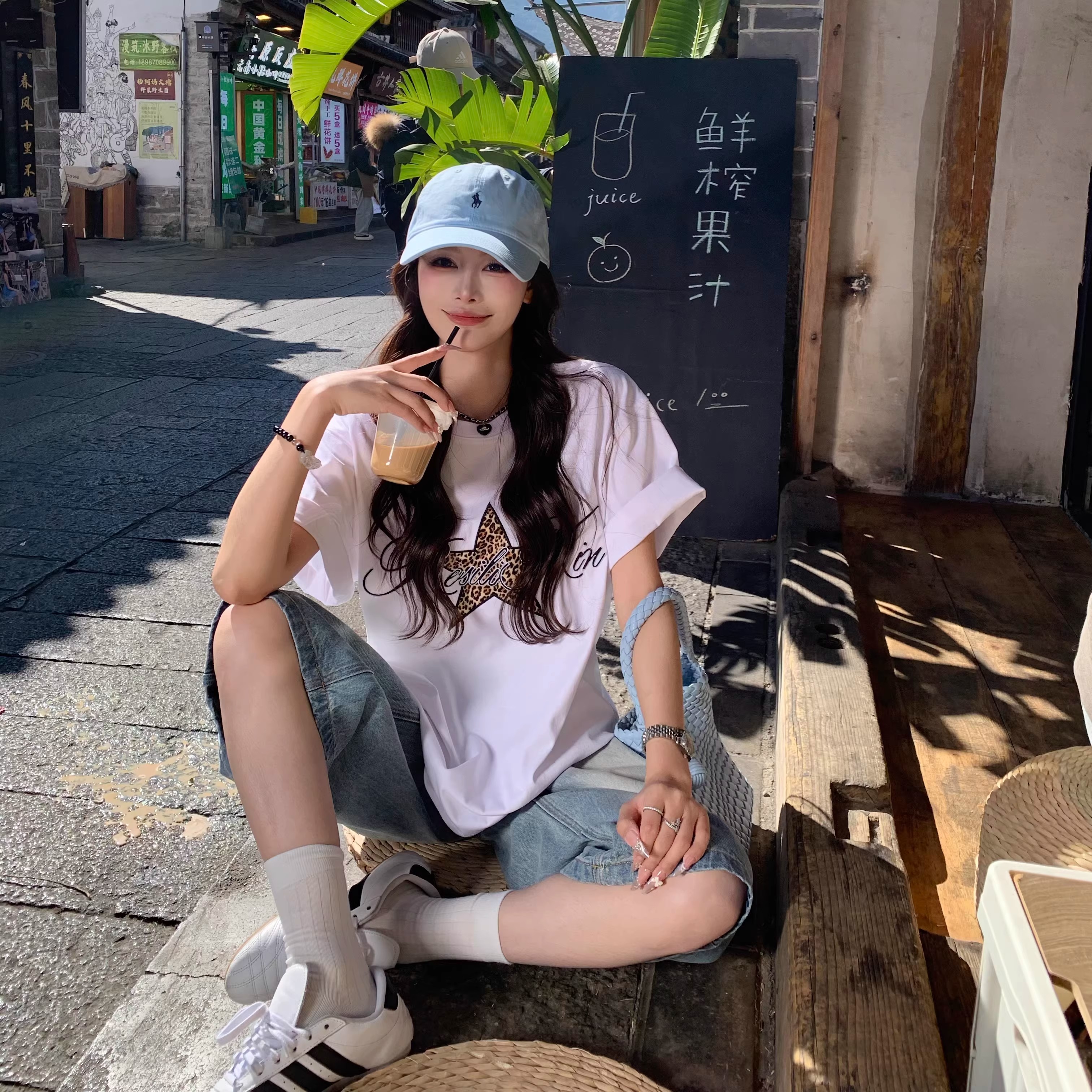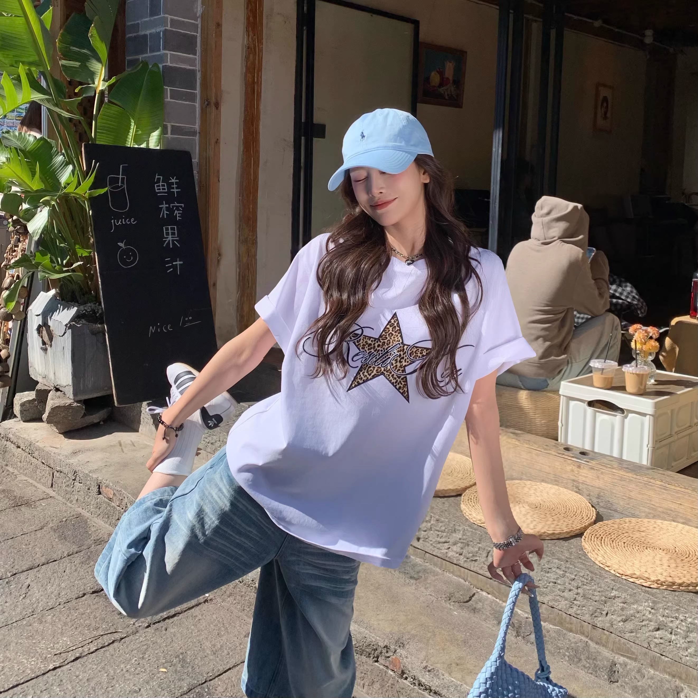 BY10145# 豹纹星星白色短袖T恤女春夏韩系宽松设计感百搭上衣 服裝批發女裝批發服飾貨源