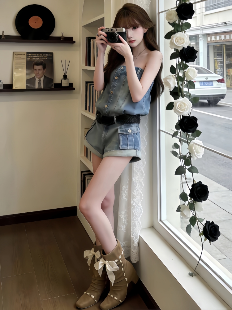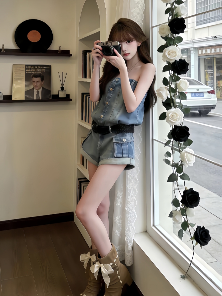 BY10434# 夏季新款性感辣妹复古蓝色牛仔抹胸连体短裤设计感大方得体连衣裤 服裝批發女裝批發服飾貨源