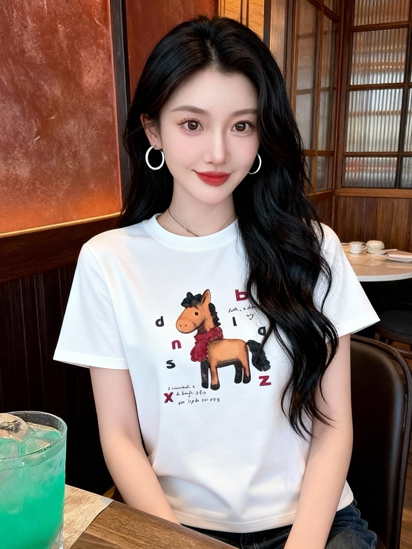 BY10463# 美式卡通印花短袖T恤女春季新款白色圆领宽松百搭小马案上衣潮 服裝批發女裝批發服飾貨源