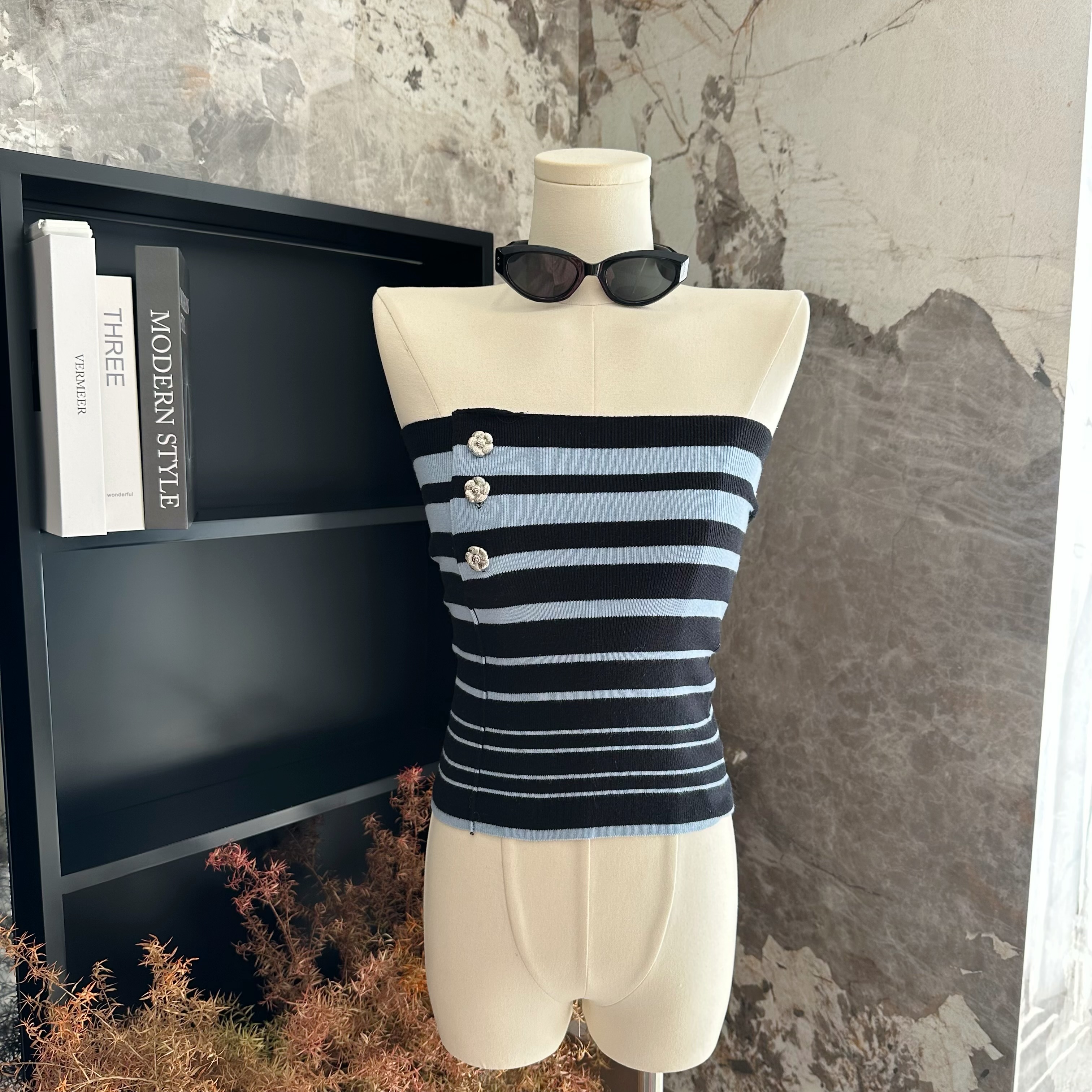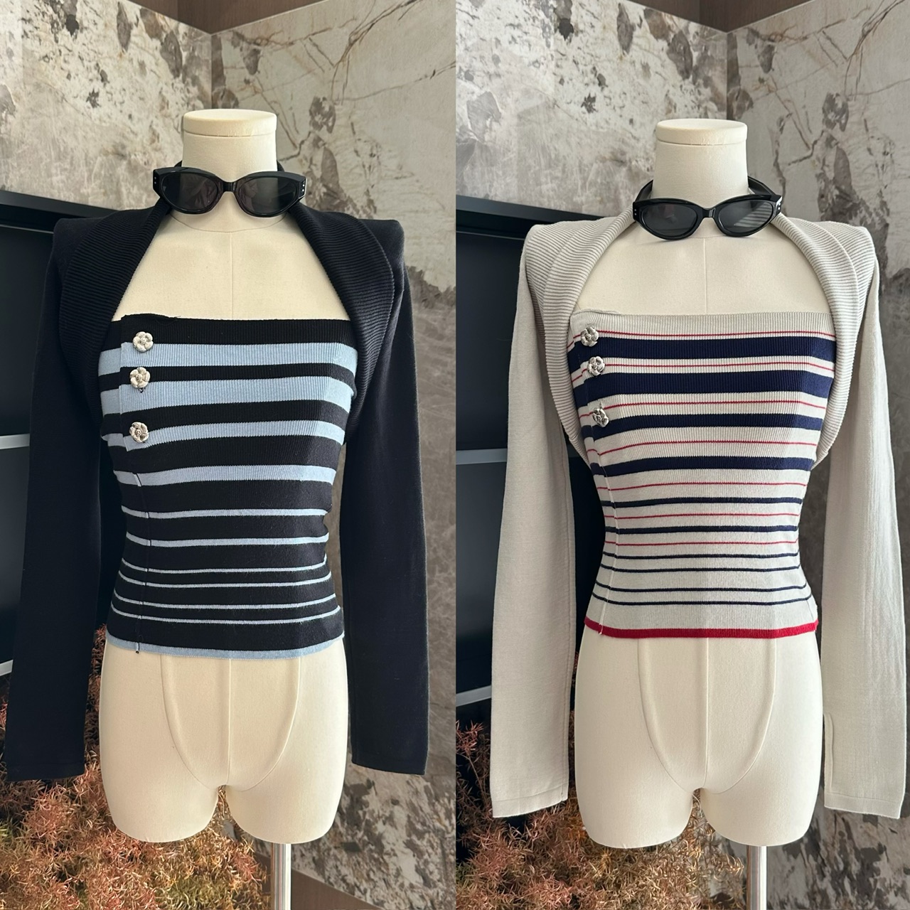 BY11161# 吴太甜条纹撞色复古手缝扣抹胸上衣女披肩小开衫两件套 服裝批發女裝批發服飾貨源